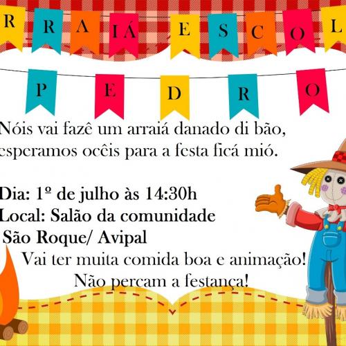 No dia 17 de junho a EMEF São Roque da Picada Rosa realiza seu arraiá no salão da comunidade a partir das 14h. Já no dia 24 de junho a EMEF Vereador Armando Taffarel realiza sua Festa no salão da comunidade a partir das 14, e também a EMEF Jordão Pinto da Silva Neto realiza seu arraiá no salão da comunidade a partir das 14h. E para encerrar a temporada, a EMEF D. Pedro I faz sua festa no salão da comunidade do São Roque Avipal no dia 1º de julho, a partir das 14h30min.