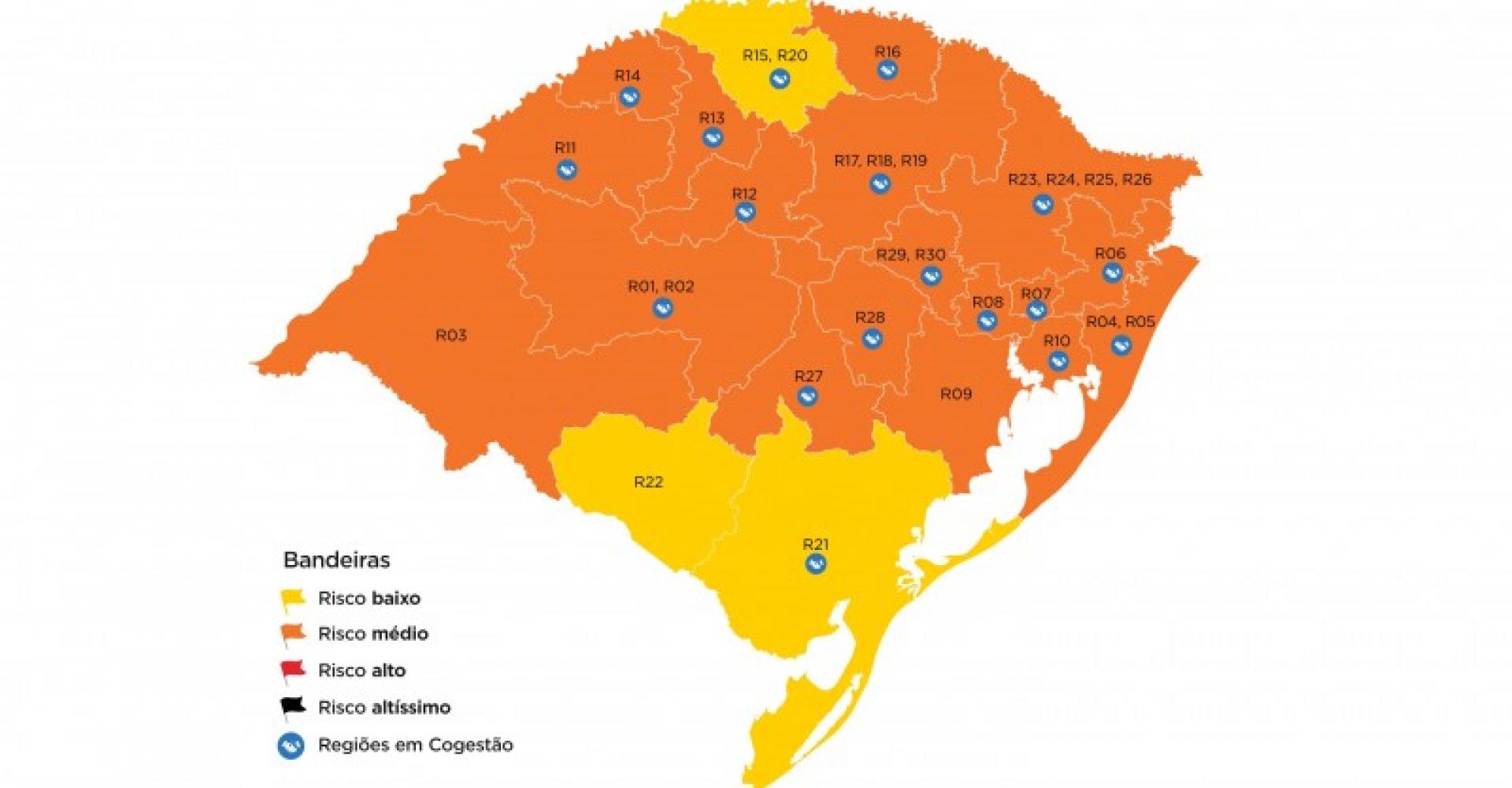 A melhora de indicadores tem sido verificada nas últimas três rodadas. Na 21ª, todas as 21 regiões foram classificadas em laranja, e na 22ª, somente a região Covid de Santa Maria ficou em bandeira vermelha. A 23ª rodada, por sua vez, traz três regiões em bandeira amarela e 18 em bandeira laranja. Dos 497 municípios gaúchos, 284 não apresentaram registro de hospitalizações e óbitos por Covid-19 nos últimos 14 dias.