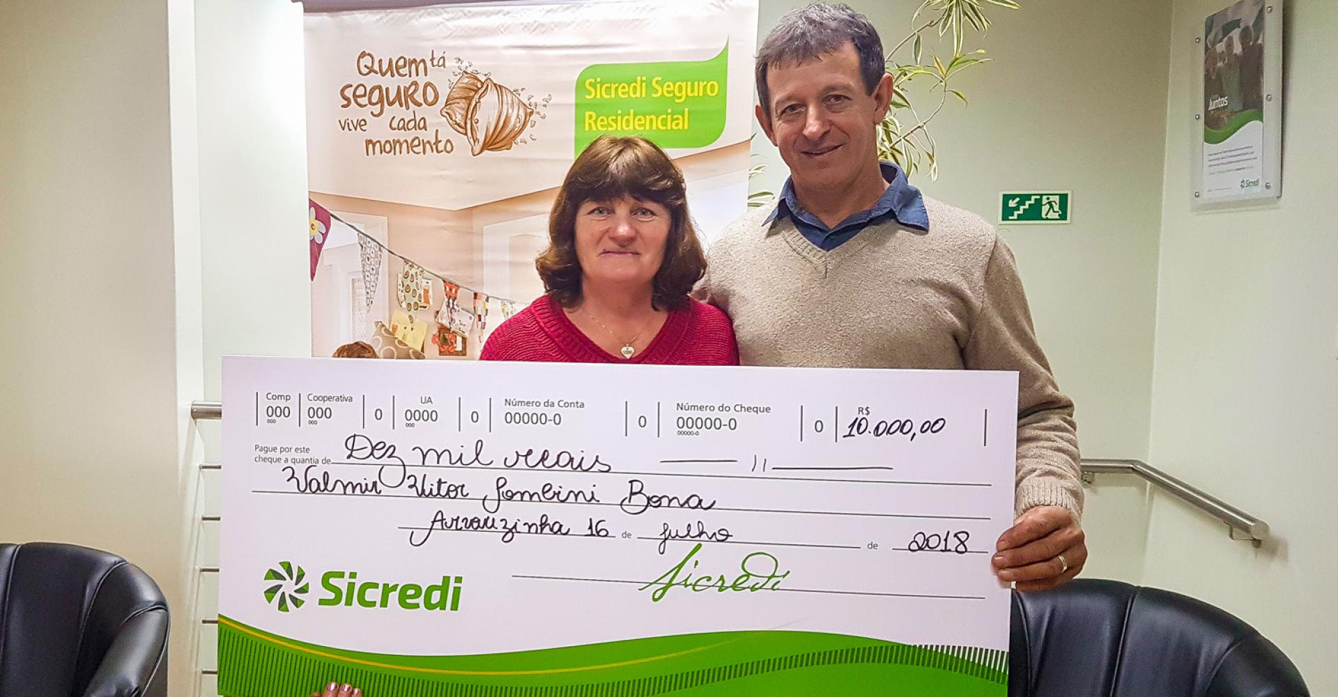 O Sicredi entregou mais um prêmio para um de seus associados da região. Valmir Vitor Tombini Bona, de Arvorezinha, foi premiado através do Seguro Residencial, recebendo o valor de R$ 10.000, pela aquisição e participação ao produto. Acompanhado de sua esposa Ana Salete Bona, ambos estiveram presentes na agência, recebendo um cheque simbólico, que oficializou a entrega do valor.