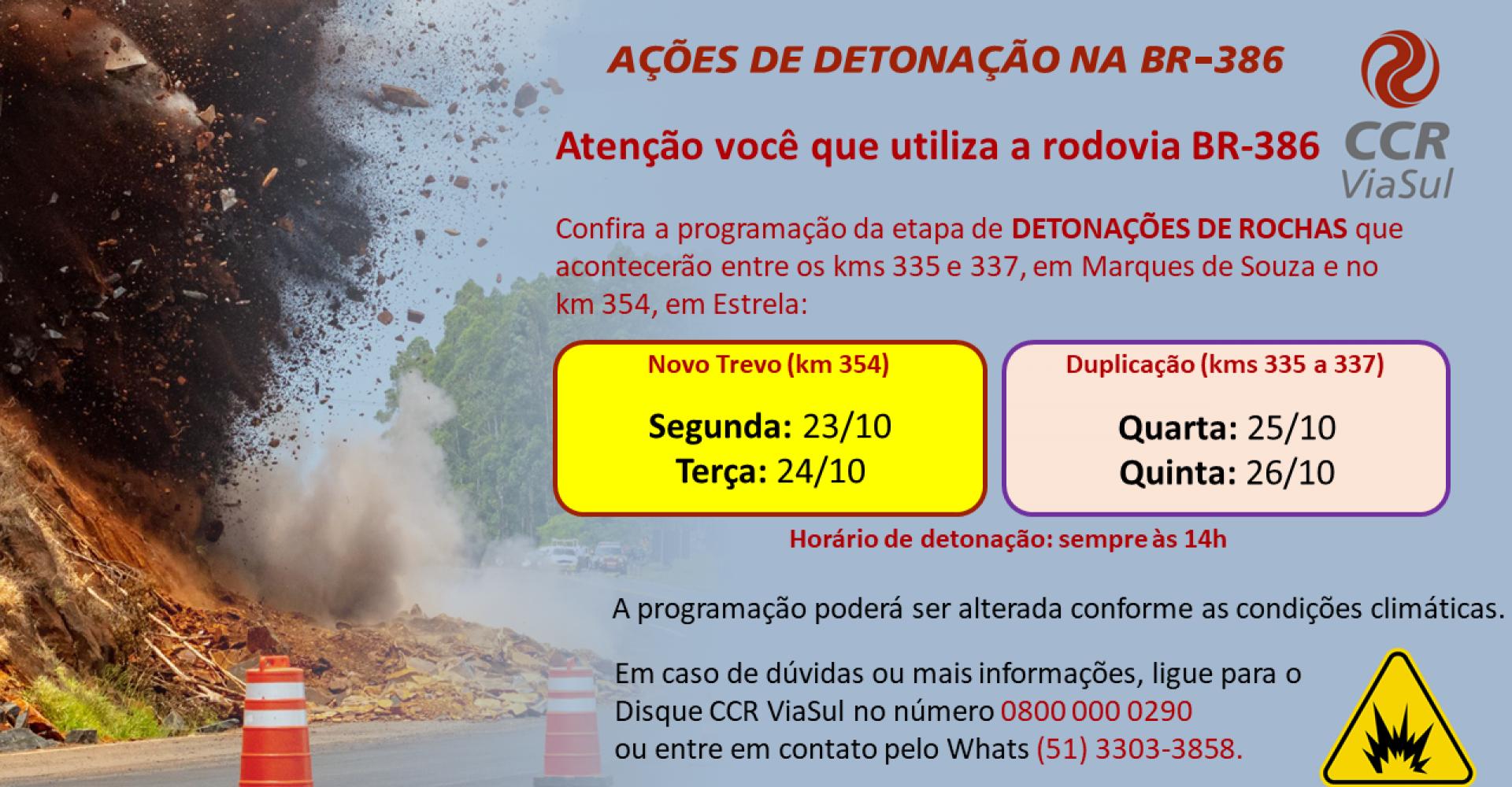 A CCR ViaSul divulga nesta sexta (20) o cronograma de detonações a serem feitas na BR-386. De acordo com a empresa, a programação será a seguinte: