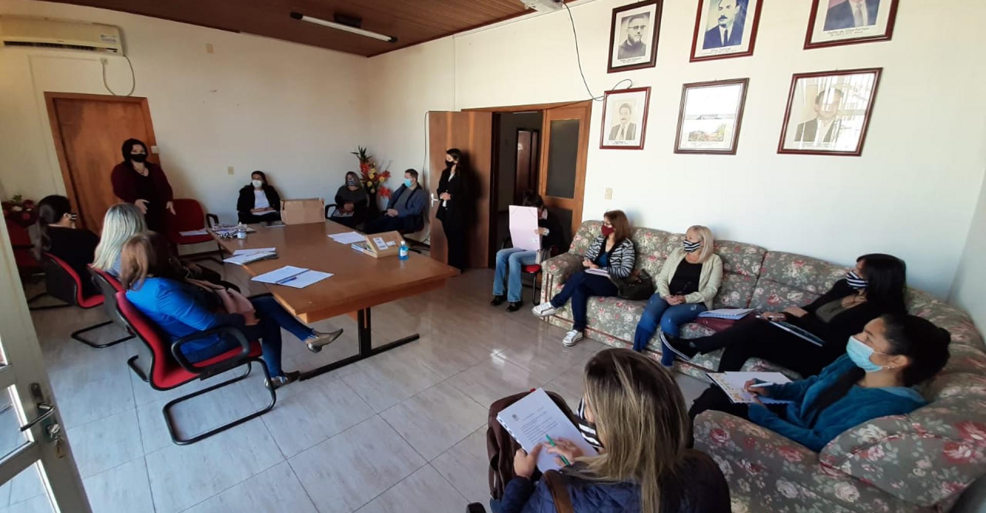 A Secretaria da Saúde por meio de seus representantes enfermeiro Thiago e a enfermeira Jane, orientaram as representantes dos COEs-Locais(Diretoras das Escolas Municipais), com relação aos Protocolos de identificação de casos sintomáticos e protocolos obrigatórios.