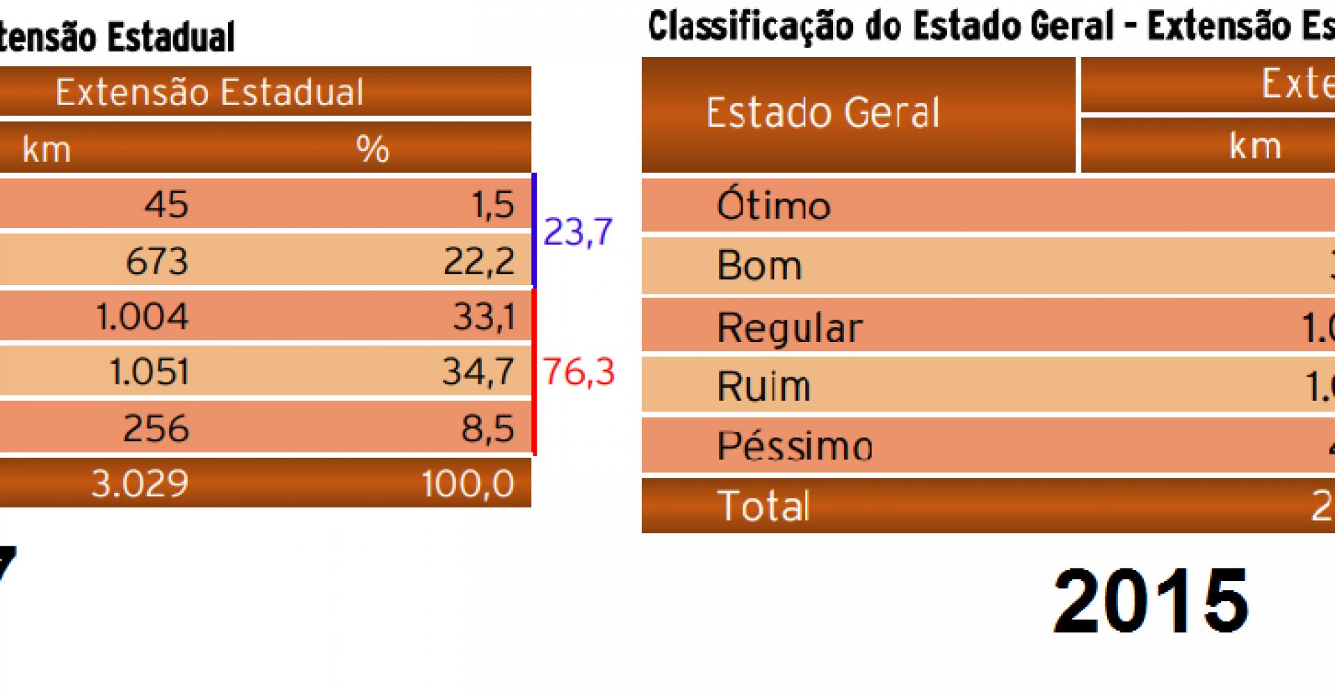 Há dois anos, a pesquisa não registrava rodovias classificadas no quesito ótimas, mas este ano o percentual aparece em 1,5%, o que representa melhora considerável. Entre as classificadas como ruins e péssimas, houve decréscimo entre os dois períodos comparados. Em 2015, 15,4% classificavam as estradas como péssimas, percentual que baixou este ano para 8,5%.