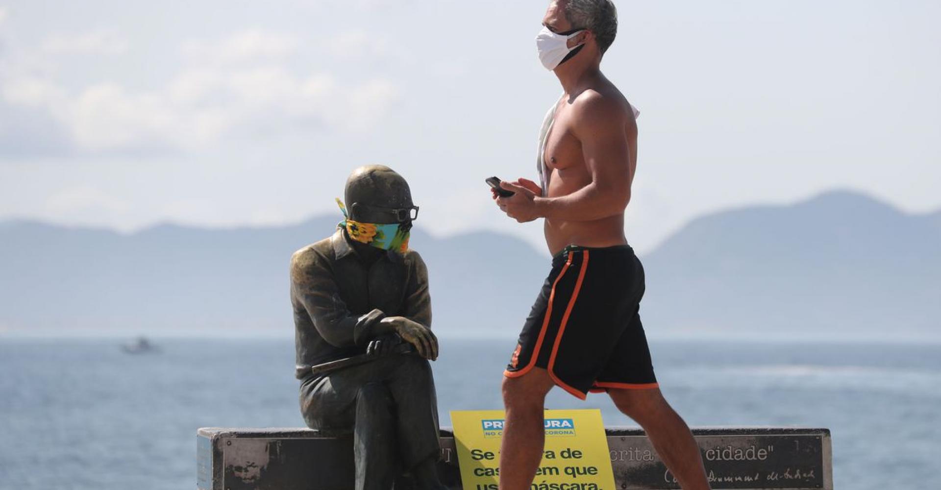 Um homem caminha ao lado da estátua do escritor brasileiro Carlos Drummond de Andrade que usa máscara protetora no primeiro dia de uso obrigatório de máscaras na cidade do Rio de Janeiro, em meio ao surto de doença por coronavírus (COVID-19), na praia de Copacabana