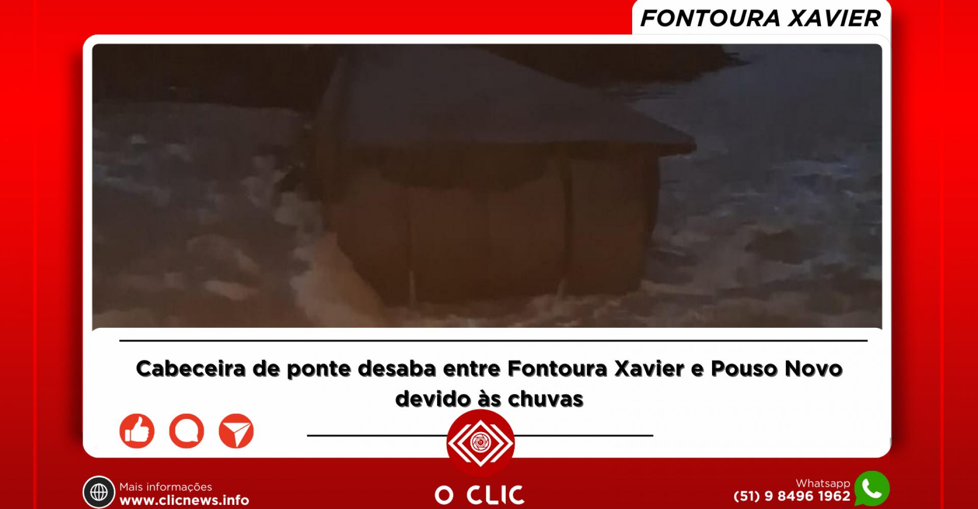 A cabeceira da ponte sobre o Arroio Dudulha, na divisa entre os municípios de Fontoura Xavier e Pouso Novo, desabou entre a madrugada e a manhã desta quinta-feira (3). O incidente foi provocado pelo grande volume de chuvas e o consequente aumento do nível da água no arroio.