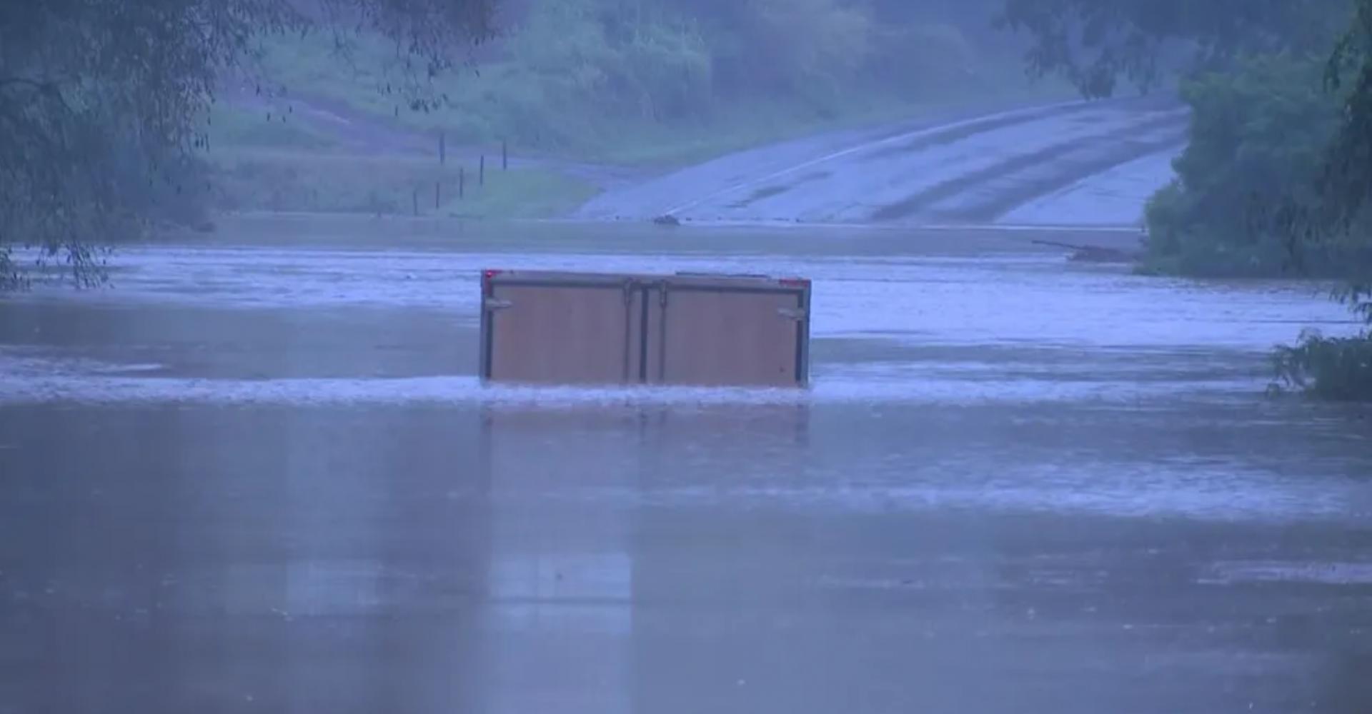 Caminhão fica submerso após água tomar conta de estrada do RS