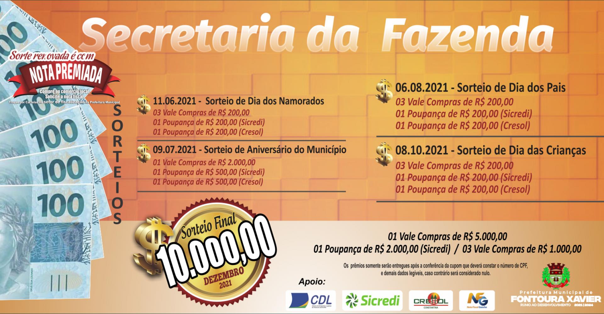 No dia 09 de julho, será realizado outro sorteio em comemoração ao Aniversário do Município. A premiação será a seguinte: