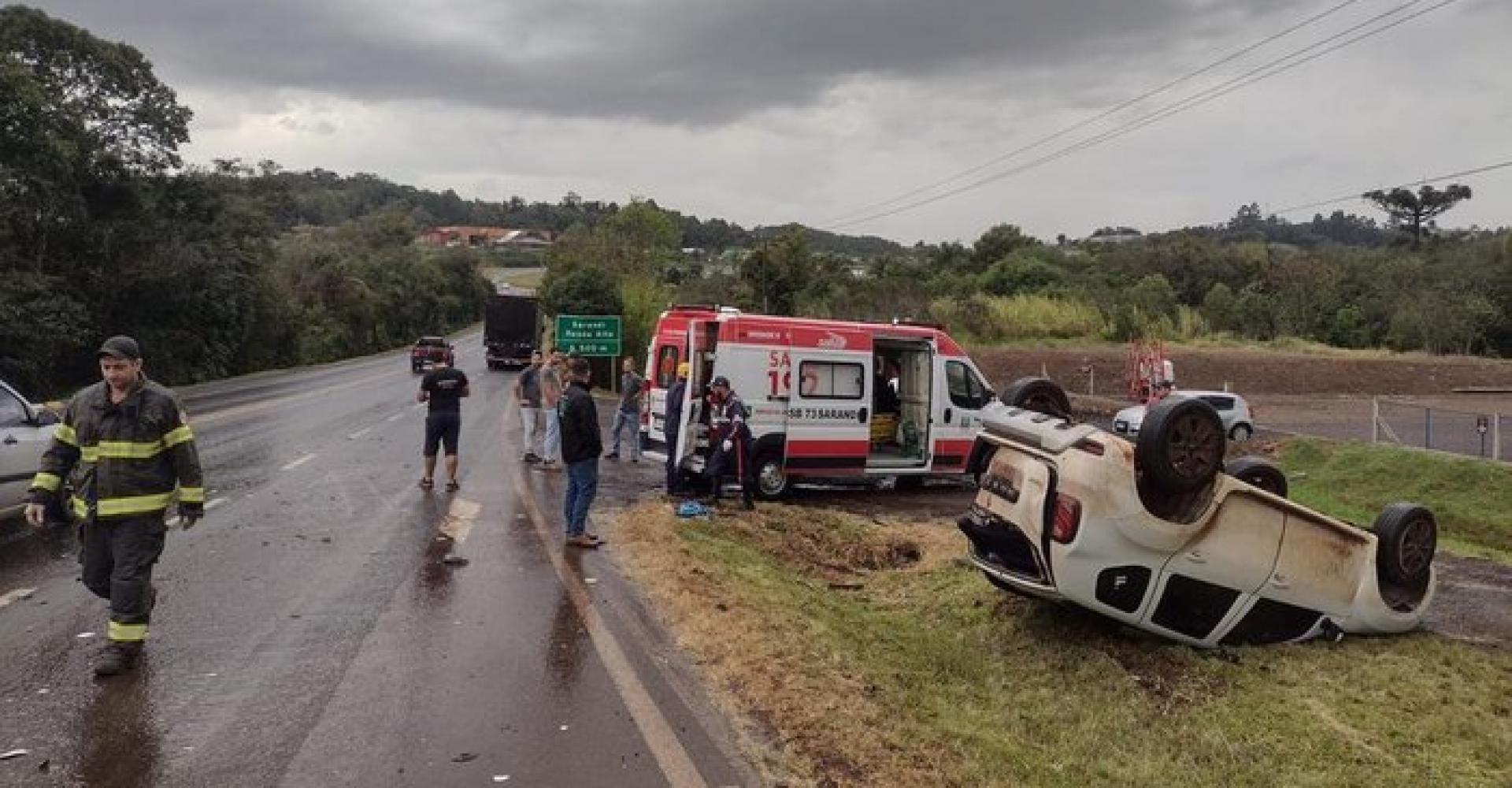 Carro capota após ser atingido por caminhão na BR-386, em Sarandi