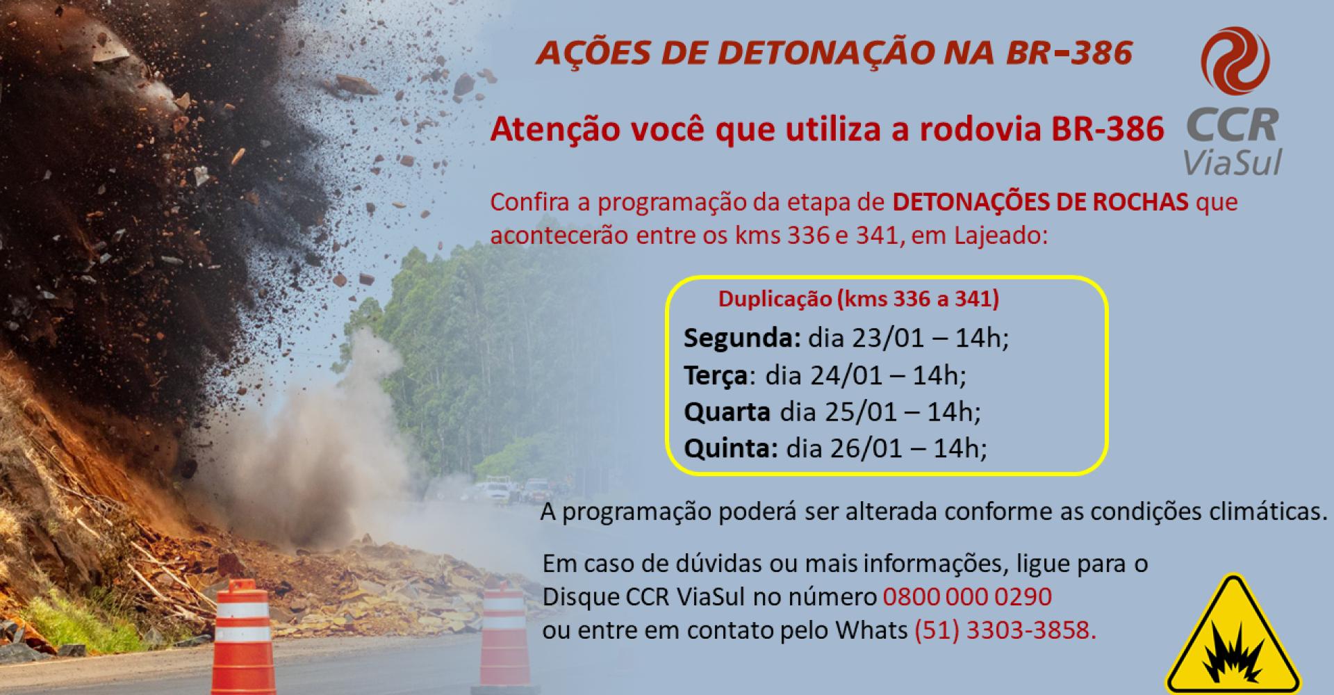 CCR ViaSul informa que seguem as detonações de rochas no trecho da duplicação da BR-386, entre os kms 336 e 341, em Lajeado. Segundo a Concessionária, as intervenções devem acontecer entre os dias 23 e 26 (segunda a quinta), sempre a partir das 14h.