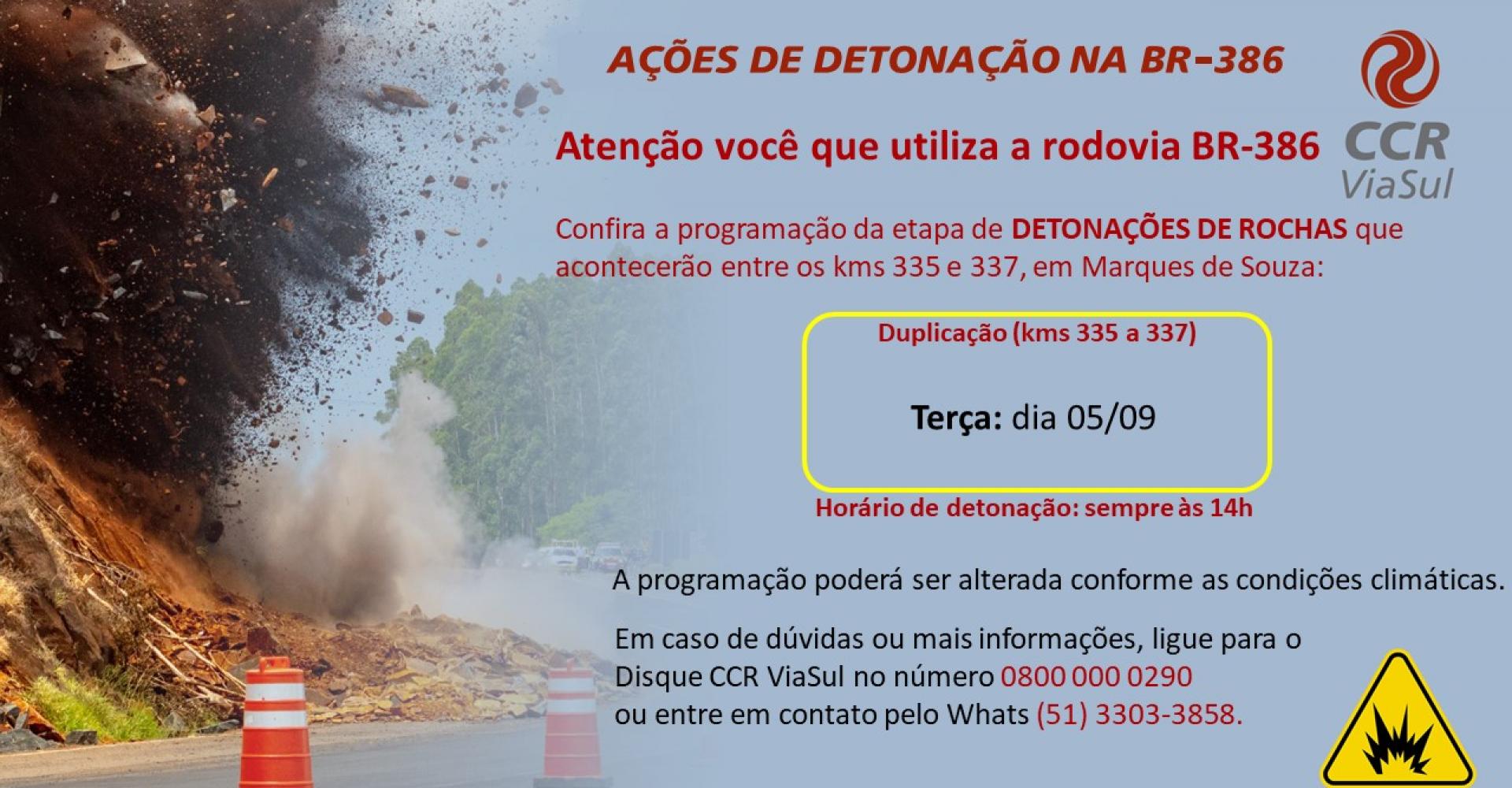 A CCR ViaSul alerta aos motoristas que pretendem seguir pela BR-386 na próxima semana sobre detonação de rochas na rodovia. Conforme a Concessionária, haverá ação de detonação, entre os kms 335 e 337 em Marques de Souza, na próxima terça-feira (05/09), às 14h.