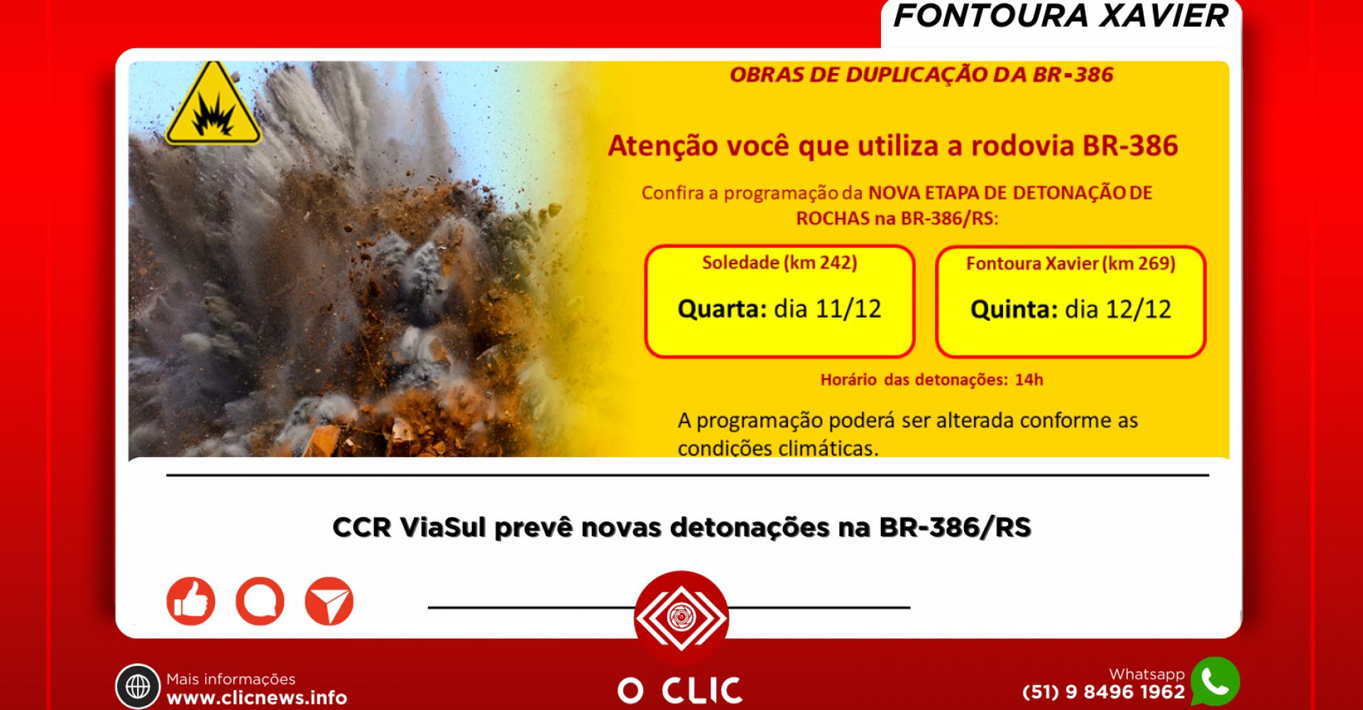 Em nova programação divulgada nesta terça (10), a CCR ViaSul informa duas detonações previstas para esta semana na BR-386/RS. Conforme a empresa, as intervenções deverão acontecer na quarta (11) e quinta (12), no km 242 e 269, em Soledade e Fontoura Xavier, respectivamente, sempre às 14h.