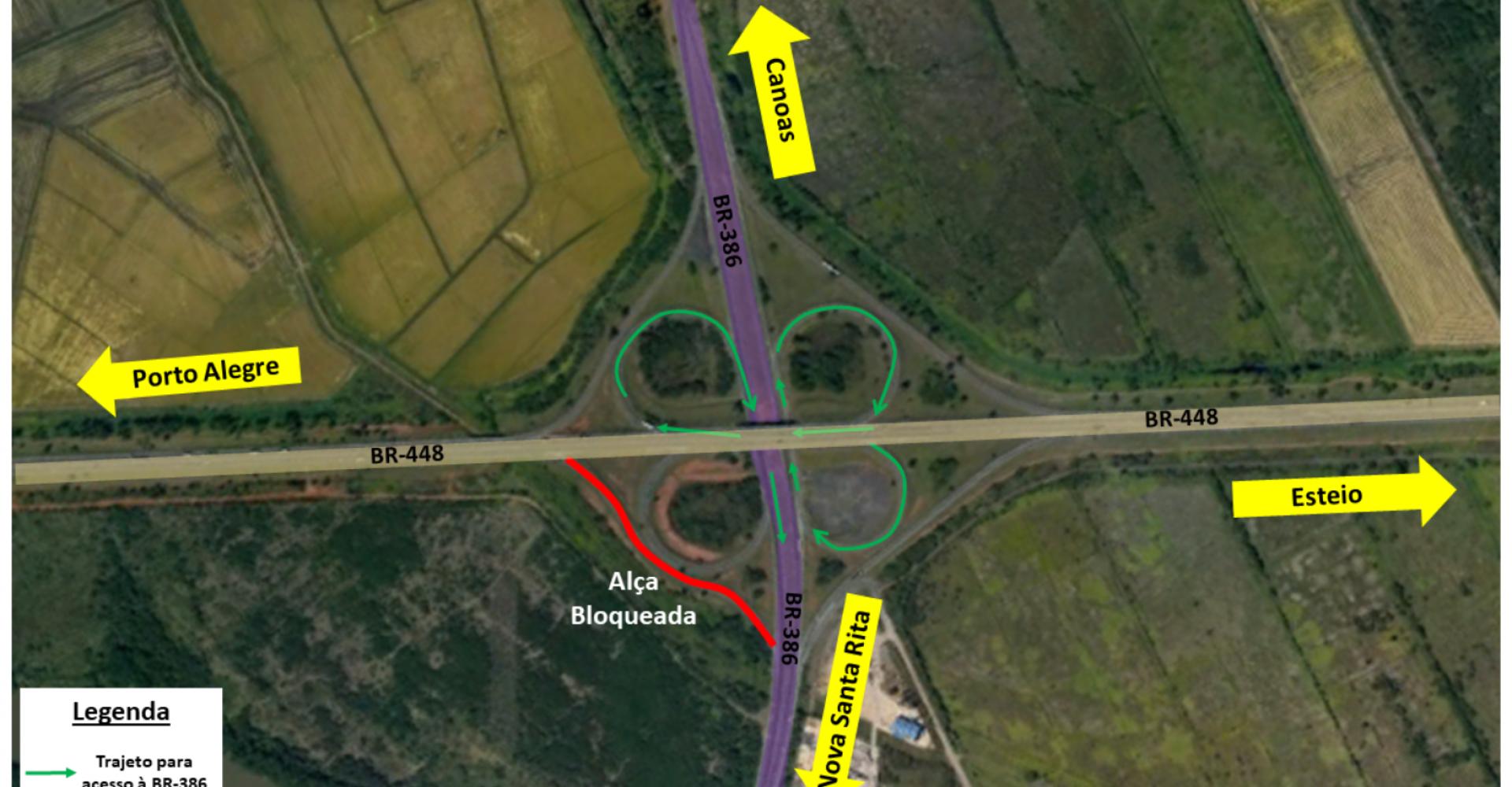 Assim, para acessar a BR-386 os motoristas deverão fazer o trevo completo, ou seja, seguir pela BR-448 até a próxima alça que dá acesso à Canoas logo à frente. Na sequência, deverão utilizar novamente a alça que dá acesso à BR-448 pela pista Sul (sentido capital). Logo após, deverão acessar, novamente, a alça que dá acesso à BR-386 e, aí sim, ingressar na rodovia pela pista Norte (sentido interior).