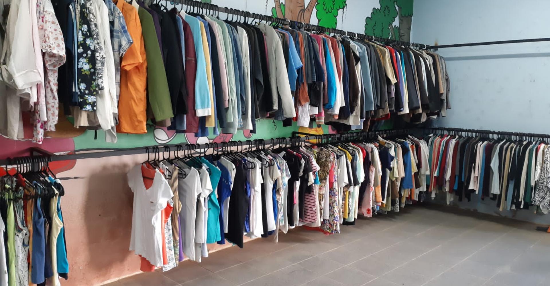 As roupas que são arrecadadas estavam misturadas e dobradas uma acima da outra. A equipe fez a aquisição de araras e novas prateleiras para dispor melhor as peças.