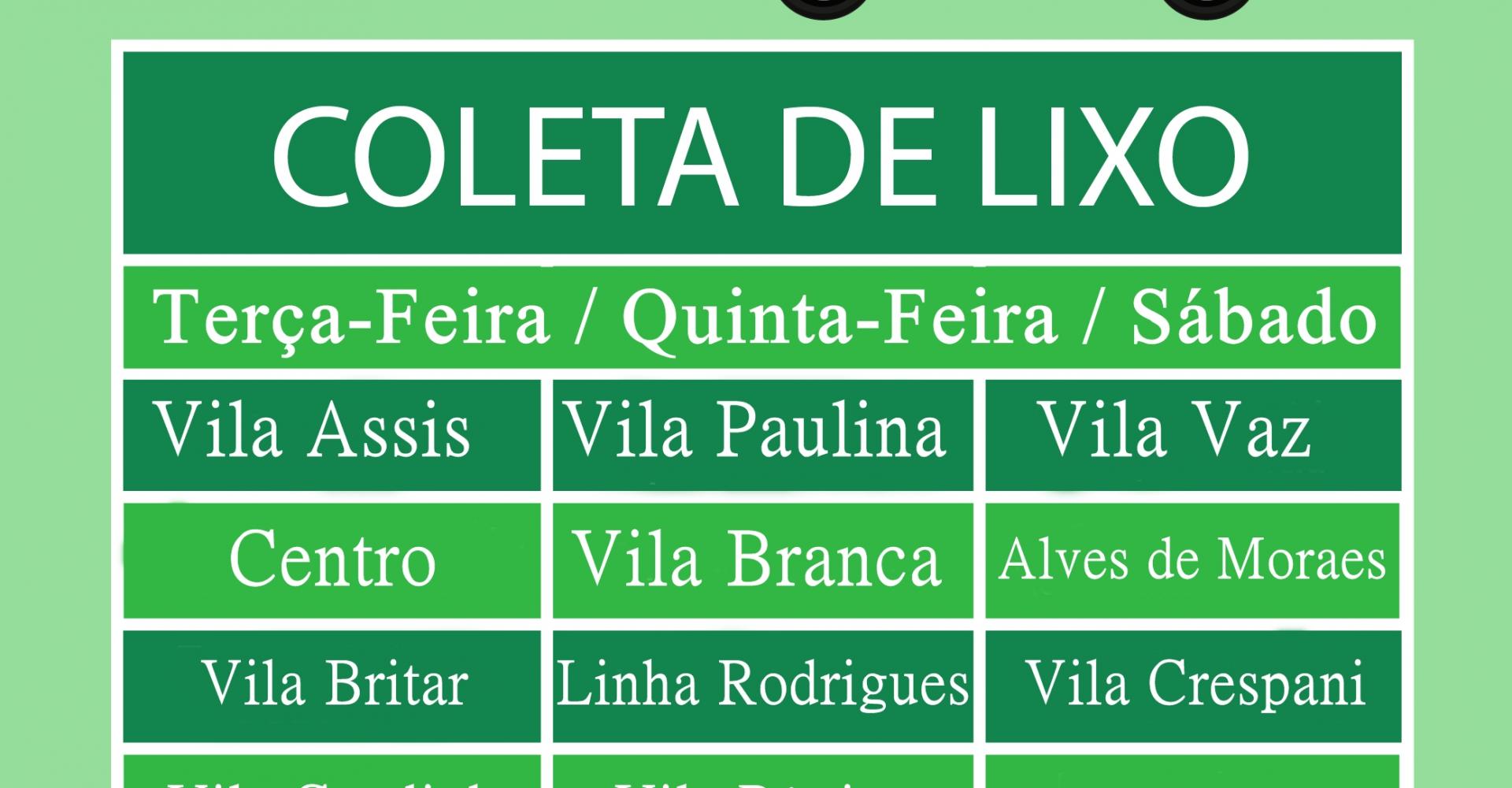 Solicitamos a colaboração dos munícipes que respeitem o horário da coleta de lixo, depositando os mesmos no dia previsto para recolhimento. Desta forma evitamos a poluição e o acúmulo de resíduos na cidade.