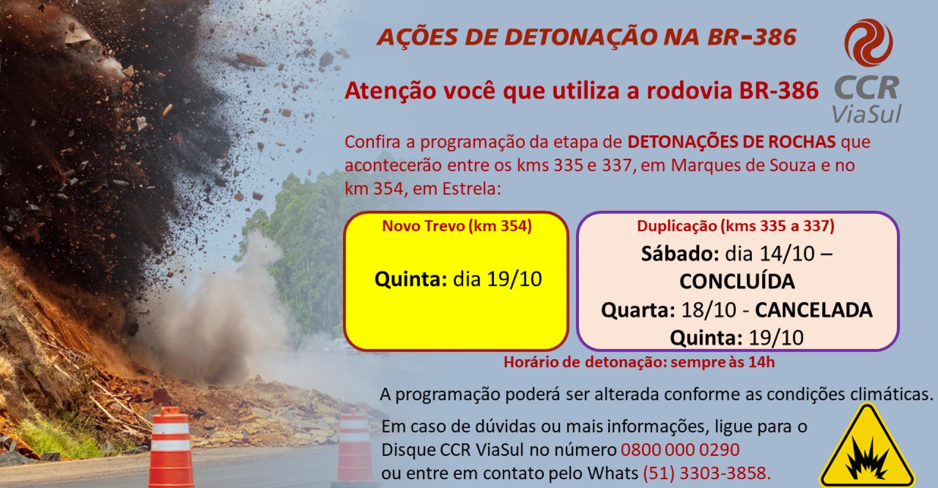 Após avaliação nos locais, a CCR ViaSul alterou a programação de detonações previstas para a BR-386 nesta semana.