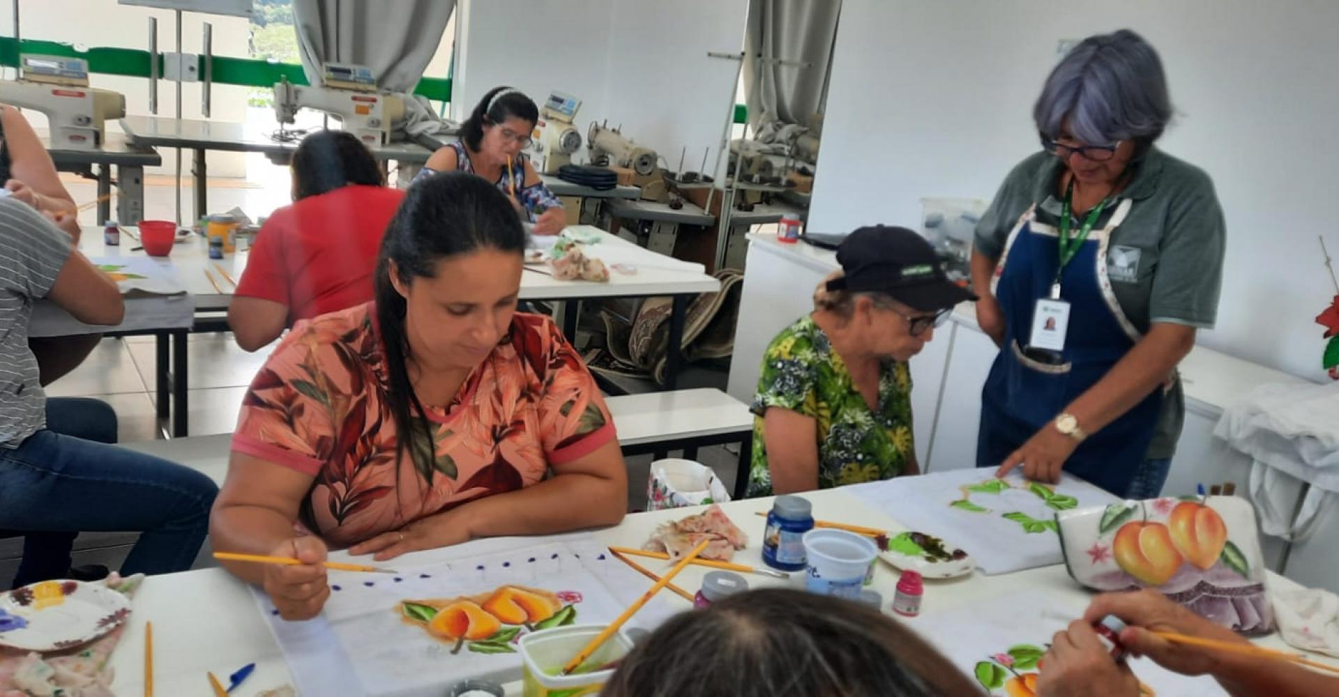 Esta semana, o CRAS Vila Vaz está oferecendo mais um curso em parceria com o SENAR: Pintura em Tecido e técnicas de tingimento. A artesã que está ministrando as aulas é Eva Daniela de Moura e a turma reuniu 14 alunas.