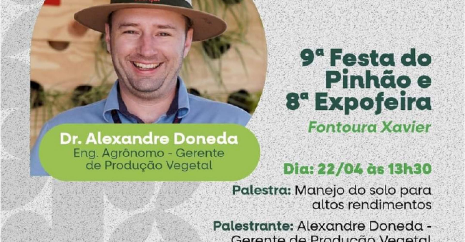 A palestra ocorrerá no pavilhão principal da 9ª Festa do Pinhão e 8ª Expofeira, na próxima sexta-feira (22), a partir das 13h30. De forma inédita, a tradicional Festa do Pinhão será realizada na Praça Municipal Dionísio Taffarel, no Centro do município de Fontoura Xavier.