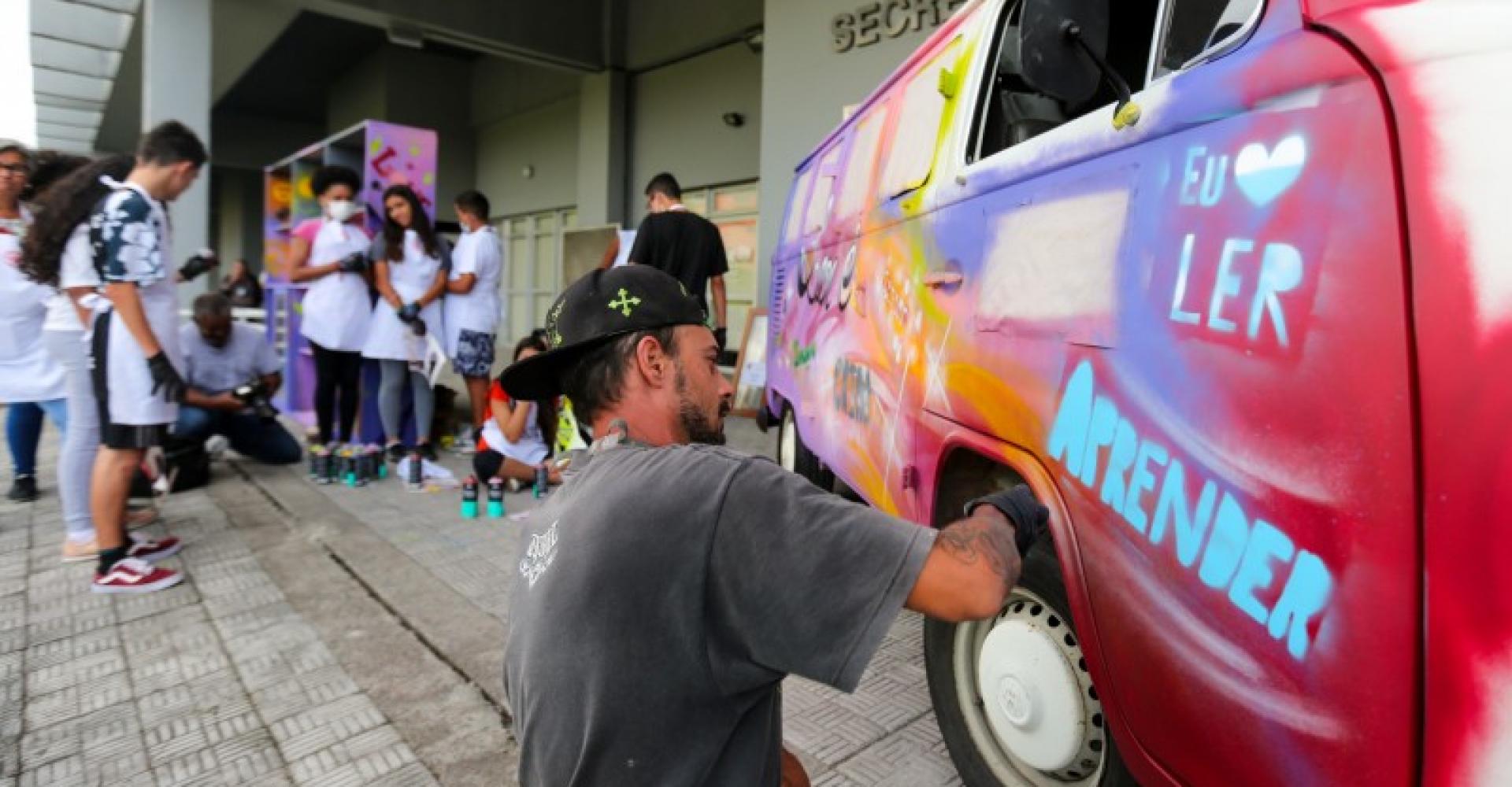 Uma Kombi em desuso acaba de virar uma biblioteca ambulante e toda colorida. A proposta de levar literatura e contação de histórias, sobre rodas, a todos os cantos do RS, é da Secretaria da Educação do Estado (Seduc) e ganhou a parceria do artista urbano Lucas Anão e de estudantes do 6º ao 9º ano da Escola de Estadual de Ensino Fundamental Aurélio Reis (Jardim Floresta). Durante a tarde da última quarta-feira, 27, eles grafitaram a lataria da Kombi, conhecida agora como EducaKombi, além de uma estante que servirá de biblioteca.