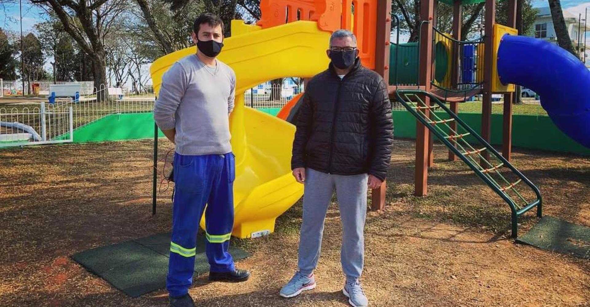 Na manhã desta quinta-feira (5), o secretário de Serviços Urbanos, Luiz Carlos da Silva Brum, juntamente com o encarregado das instalações, Jonas da Rosa Vaz, estiveram averiguando as dependências do parquinho na praça central.
