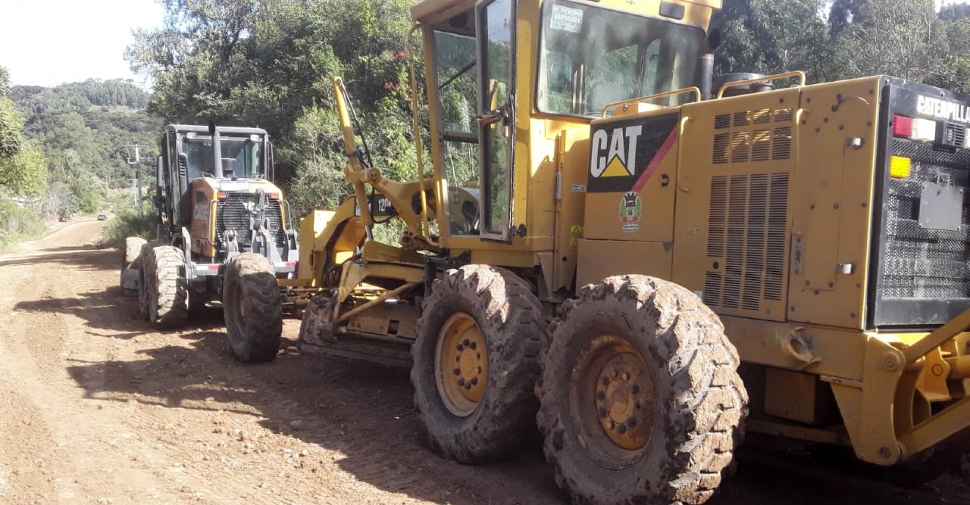 As obras estão sendo executadas durante todo o dia. Duas patrolas estão trabalhando na reconstrução.
