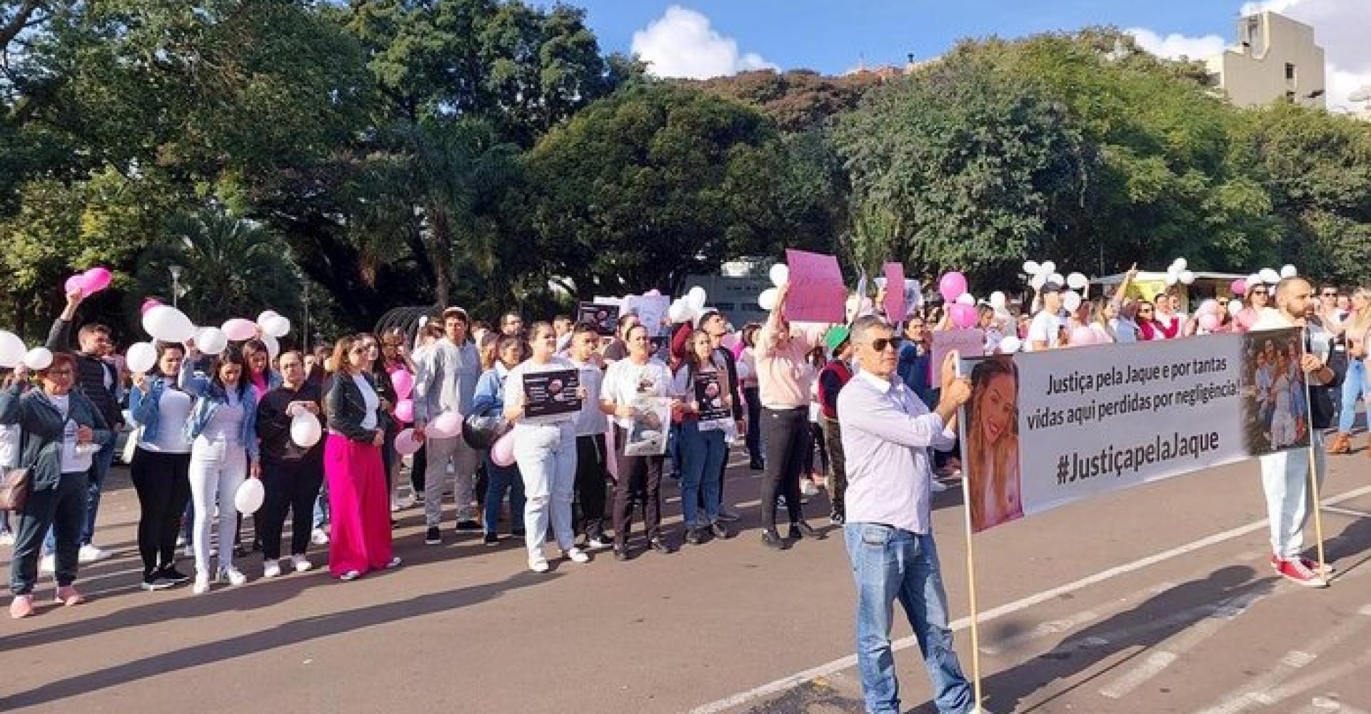 Balões e cartazes branco e rosa tomaram a praça em frente ao Hospital de Clínicas de Passo Fundo, a partir das 15h deste domingo (9), como forma de homenagear Jaqueline Quadros da Silva Ferreira. Ela morreu no dia 27 de junho, quatro dias após dar à luz a filha, Maria Flor Ferreira Quadros. A manifestação reuniu cerca de 150 pessoas, entre familiares e amigos da vítima.