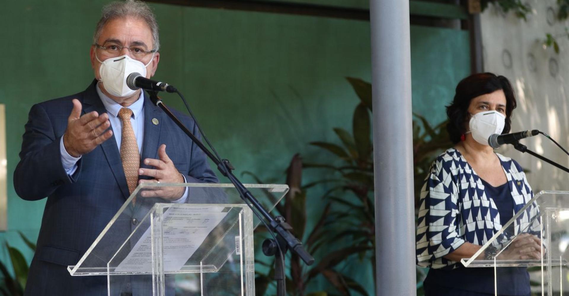O ministro da Saúde, Marcelo Queiroga e a presidente da Fundação Oswaldo Cruz (Fiocruz) Nísia Trindade, em coletiva após visita às instalações de produção da vacina da Fiocruz/ Oxford /AstraZeneca, no Rio de Janeiro.