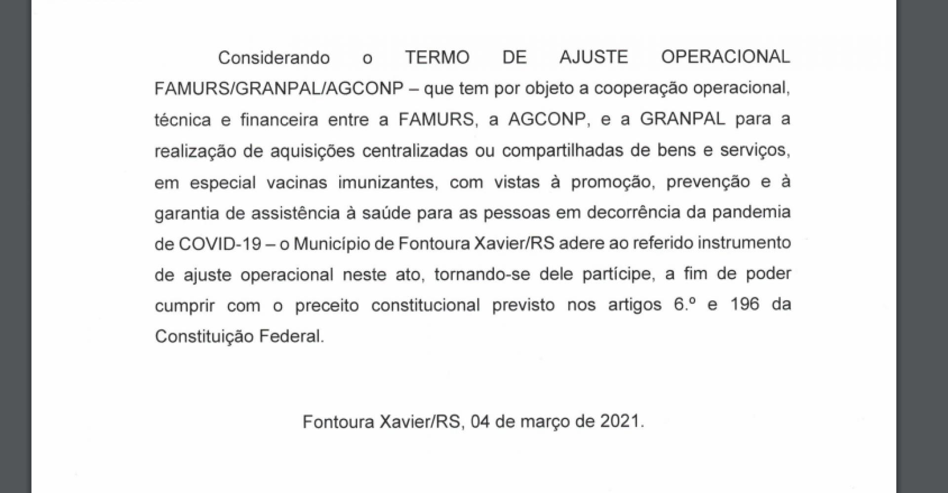 De acordo com o Prefeito de Fontoura Xavier, Luiz Armando Taffarel, este ato é uma importante alternativa para dar mais celeridade à imunização da população, para que as vacinas cheguem em maior quantidade e velocidade.