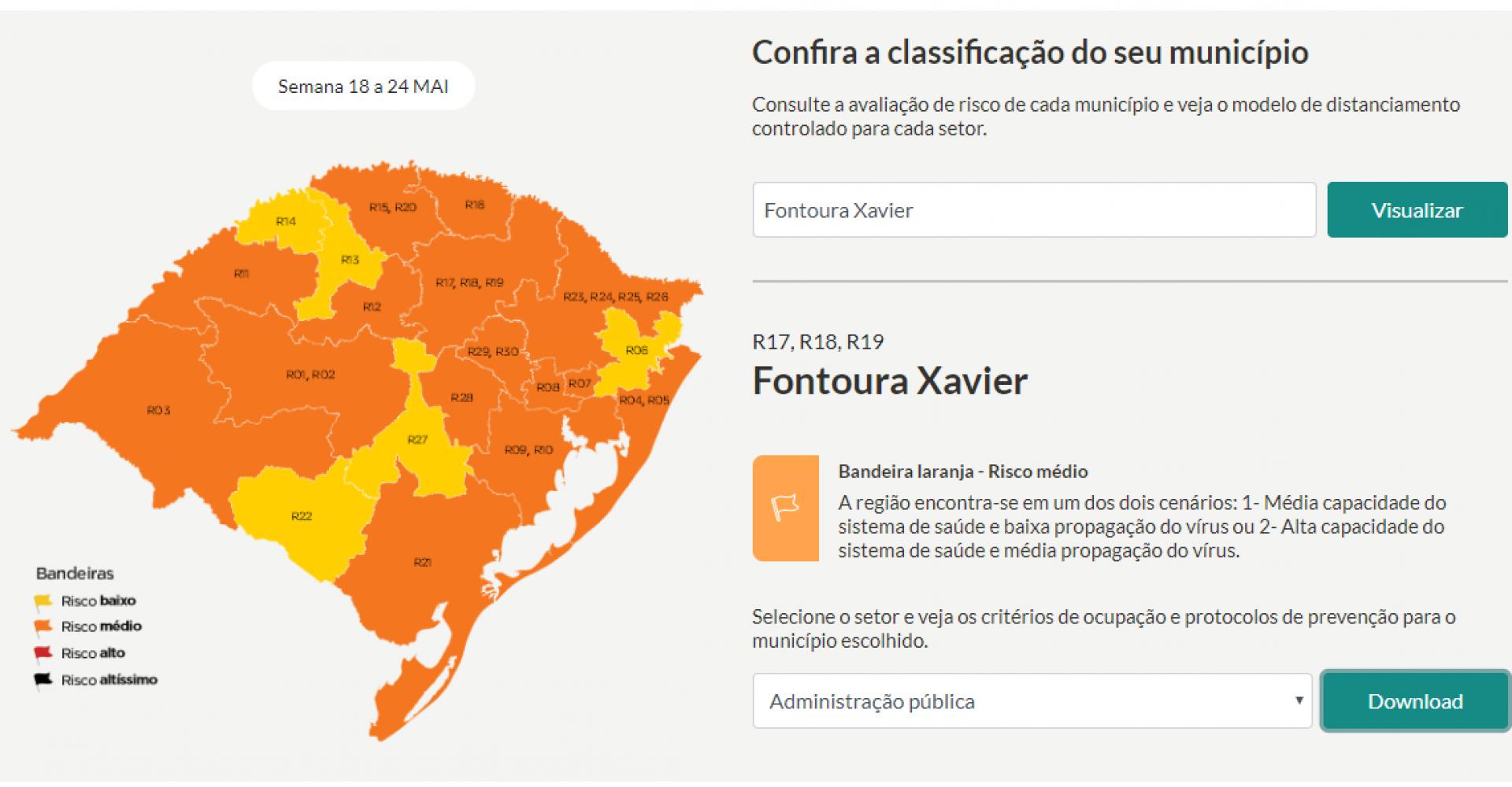 A classificação das regiões de acordo com as bandeiras determinadas pelo Distanciamento Controlado foi atualizada pelo governo do Estado no sábado (16/5). Entre os dias 18 e 24 de maio, não há regiões na bandeira vermelha. Fontoura Xavier permanece em bandeira laranja.