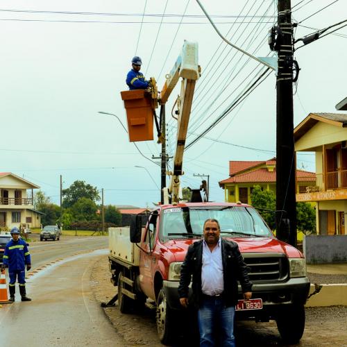 A instalação da nova iluminação está em fase de conclusão e estará substituindo 47 luminárias na via pública, desde a entrada da cidade na BR 386, até a esquina da Avenida 9 de Julho com a Rua Pedro Azelin da Silva.