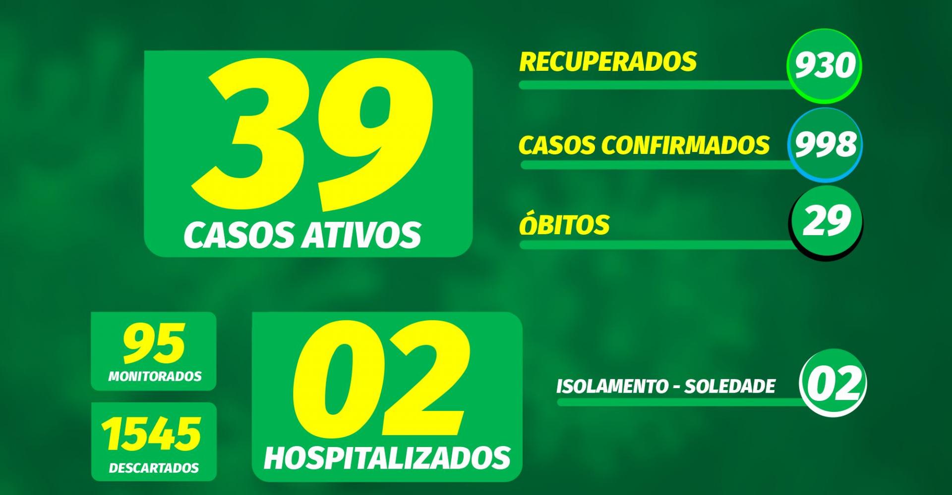 Até o presente momento, o município conta com 998 casos confirmados, destes, 930 foram recuperados e 29 pessoas faleceram.
