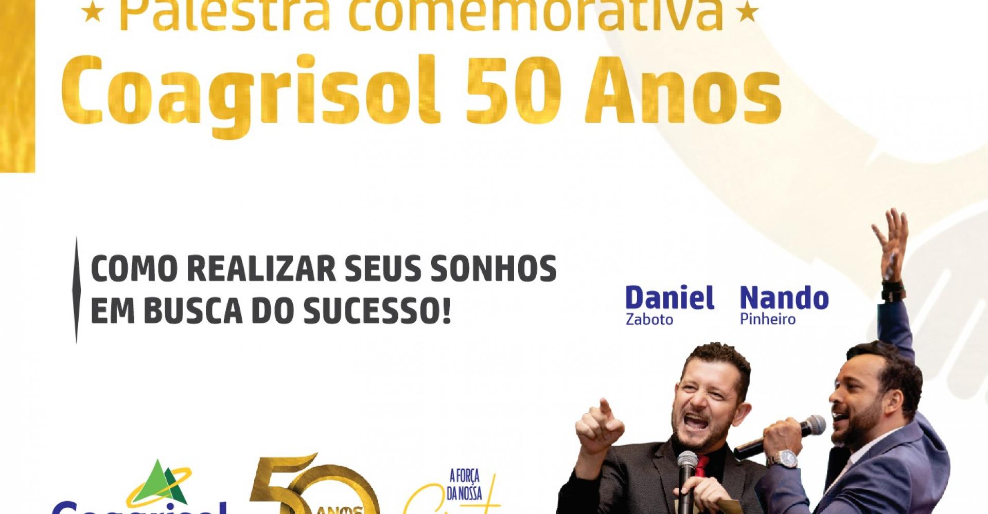Ao comemorar seu aniversário de 50 anos , a Coagrisol presenteará a comunidade de sete municípios com um ciclo de palestras. As atividades acontecem de 30 de agosto a 05 de setembro, trazendo Nando Pinheiro e Daniel Zaboto, dupla paulista que abordará o tema “ Como Realizar Seus Sonhos em Busca do Sucesso”, os palestrantes possuem um dos maiores canais de motivação do Brasil na plataforma de vídeos Youtube.