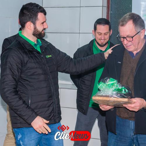 Para finalizar o momento, foi feito um agradecimento especial e feita a entrega de um mimo ao Instrutor do curso, Cleverson, e ao Senhor Clóvis, ao qual acompanhou todo o processo do curso.
