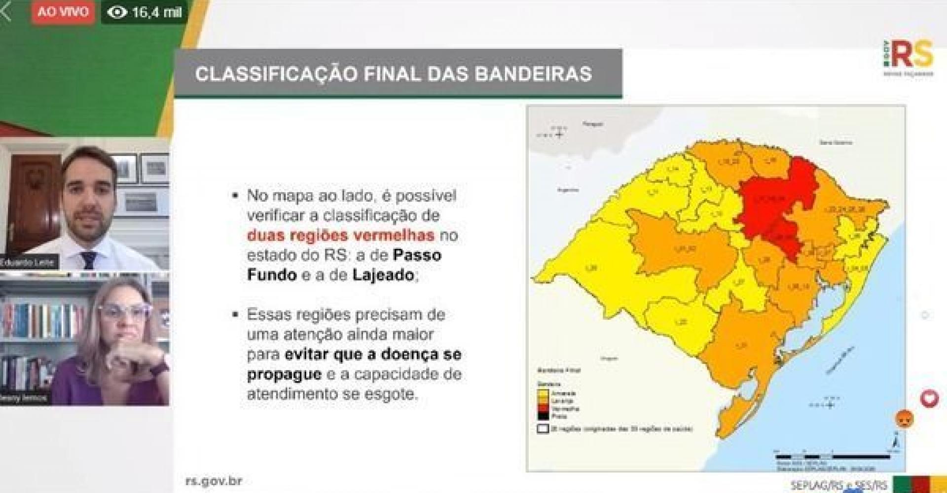 As regiões de Lajeado e de Passo Fundo foram classificadas com a bandeira vermelha, que representa risco máximo de contaminação por coronavírus. O novo modelo de distanciamento foi apresentado na tarde desta quinta-feira (30), através de uma live transmitida na página do Facebook do Governo do Estado.