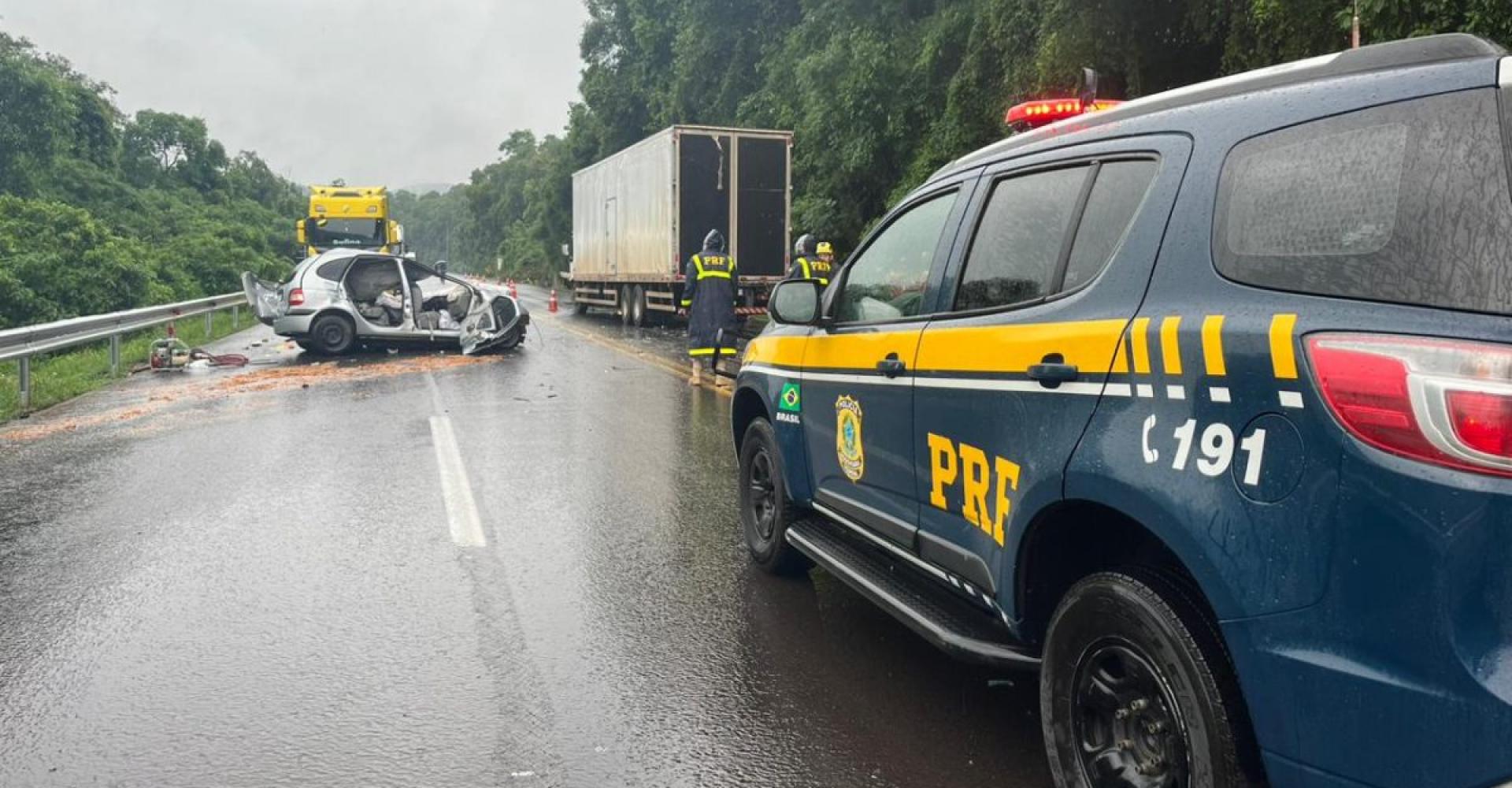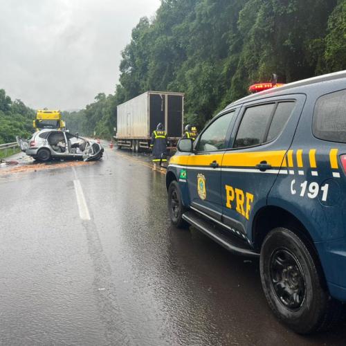 Motorista do caminhão ficou ileso. Condutora do carro, uma mulher de 51 anos e moradora de Fontoura Xavier, veio a óbito no local.