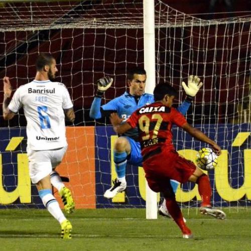 Só que a zaga gremista funcionou no ataque, mas teve um dia terrível em sua própria área. Aos 22 minutos, Everton Felipe apareceu sozinho na área e desviou esquisito na cobrança de escanteio, Grohe pulou atrasado e a bola morreu mansinha para o 3 a 2. E a situação ficou pior ainda aos 29 minutos. Serginho disparou pela direita, invadiu a área e caiu no contato com Marcelo Oliveira. O árbitro anotou o pênalti duvidoso que Diego Souza cobrou e correu para o abraço com o 4 a 2.