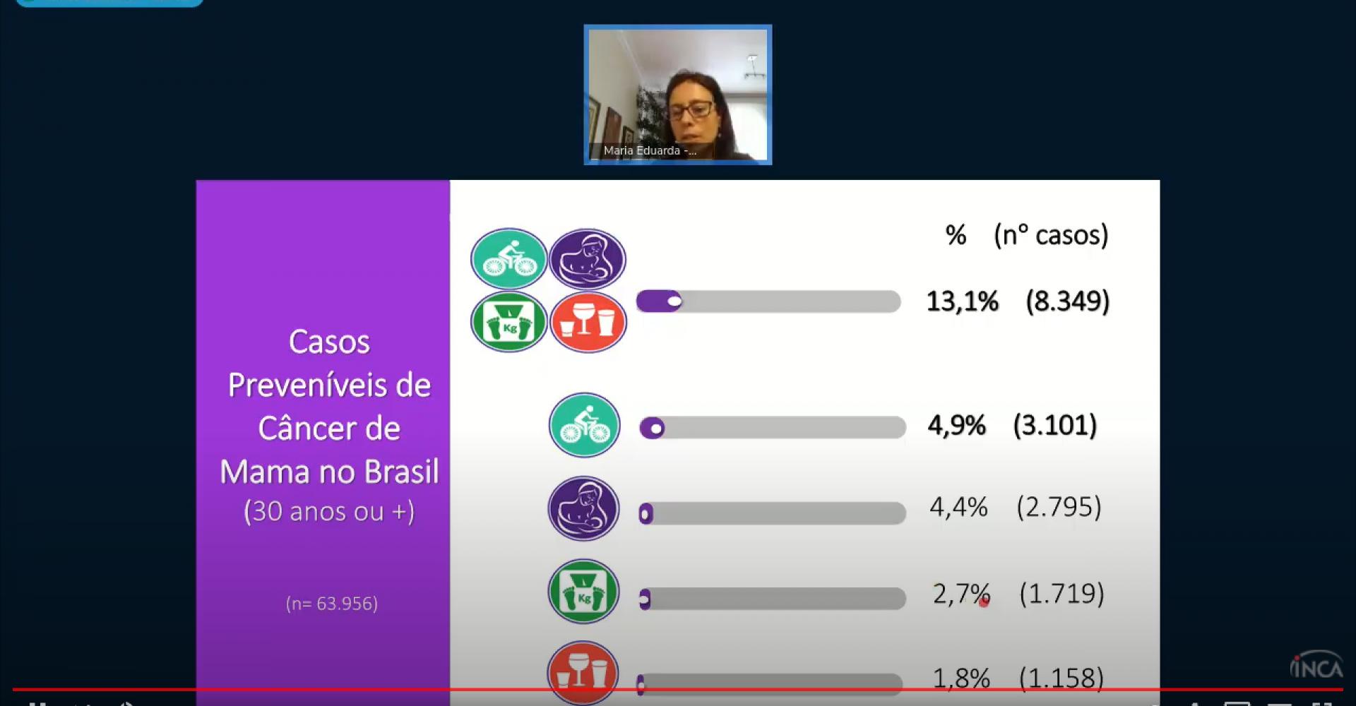 Os dados foram divulgados na pesquisa Número de casos e gastos com câncer de mama no Brasil atribuíveis à alimentação inadequada, excesso de peso e inatividade física, elaborada pela Coordenação de Prevenção e Vigilância (Conprev) do INCA e apresentada durante webinar (seminário virtual) de abertura do Outubro Rosa deste ano, transmitido pela TV INCA.