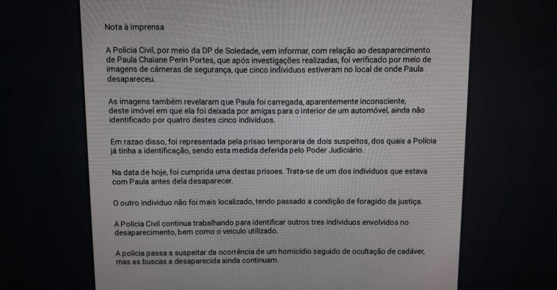 Em Nota à Imprensa emitida no final da tarde desta terça-feira, dia 16 de junho, a Polícia Civil esclareceu que a investigação continua e que imagens de câmeras de segurança mostram o momento em que Paula foi carregada, aparentemente desacordada, de dentro do imóvel onde foi deixada pela amiga, para dentro de um veículo.