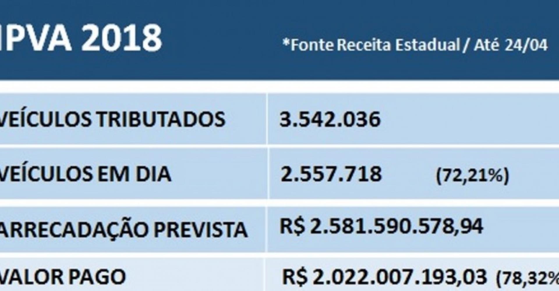 De uma arrecadação de R$ 2,581 bilhões projetada para este ano, o calendário de 2018 do IPVA (Imposto sobre Propriedade de Veículo Automotor) fechou com uma inadimplência de 21,68%. A arrecadação bruta chegou a R$ 2,022 bilhões. De uma frota de 3.542.036 veículos que deveriam pagar o imposto até a última segunda-feira (23), quando venceu o prazo para placas com final “0” (zero), 984.318 estão circulando pelas ruas com o IPVA atrasado.