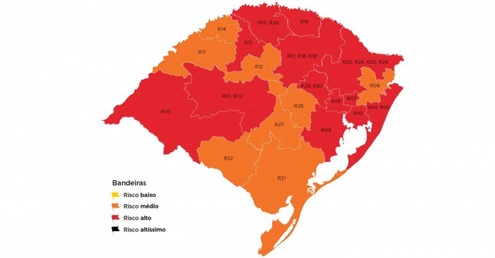 As regiões Covid de Novo Hamburgo, Capão da Canoa, Canoas e Ijuí já haviam sido classificadas como risco alto na rodada vigente e, neste mapa preliminar, seguem em vermelho. Unem-se a elas as regiões de Caxias do Sul, Uruguaiana, Erechim, Palmeira das Missões, Porto Alegre, Passo Fundo, Guaíba, Santa Maria e Lajeado.