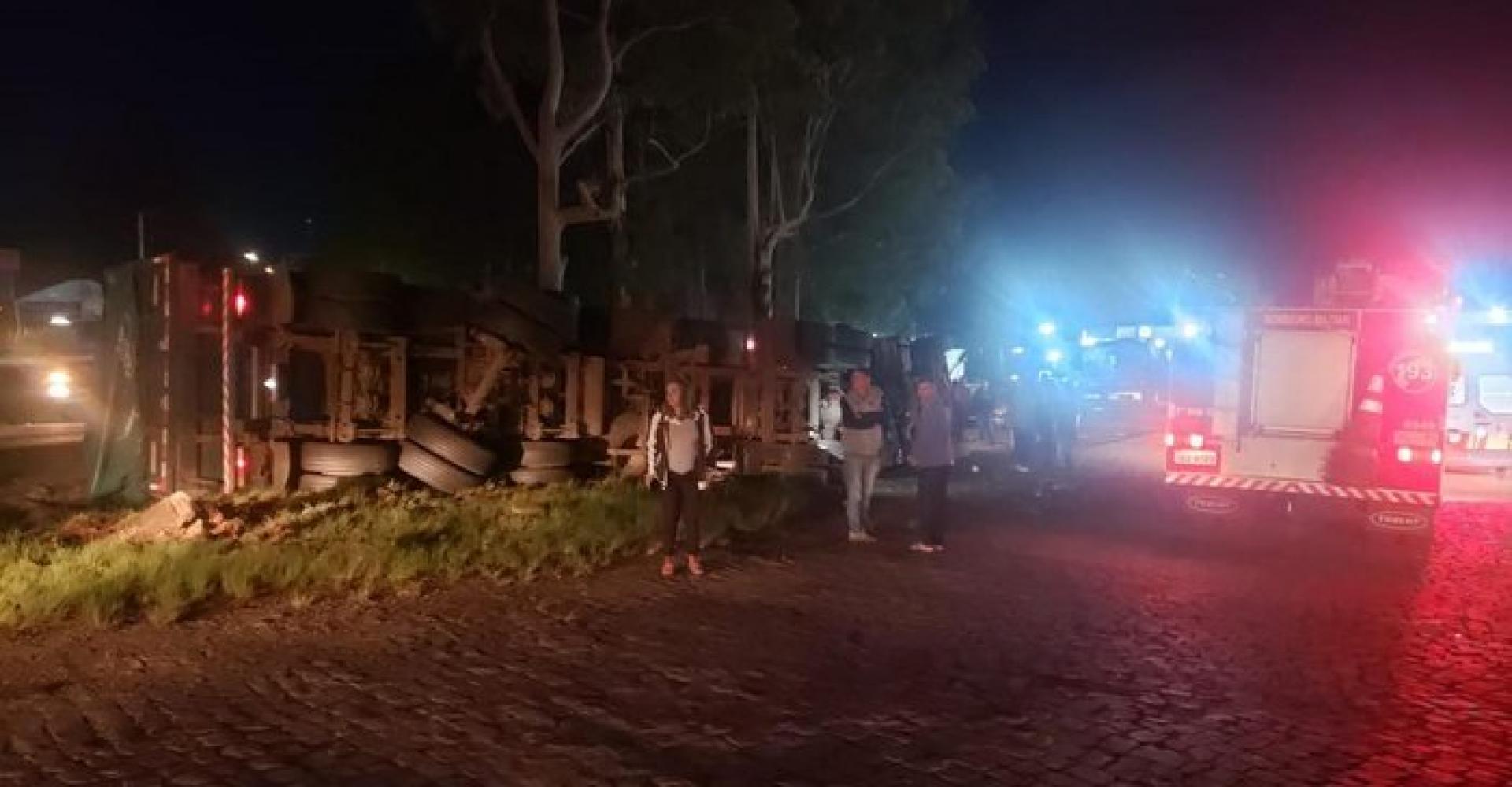 Conforme o Corpo de Bombeiros, o caminhão, com placas de Passo Fundo, trafegava no sentido Capital-Interior, quando teria sido cortado por um veículo e tombou ao tentar desviar. O caminhão estava carregado com cevada. Com o tombamento, parte da carga ficou espalhada sobre o pátio de um posto de combustível, à margem da rodovia.