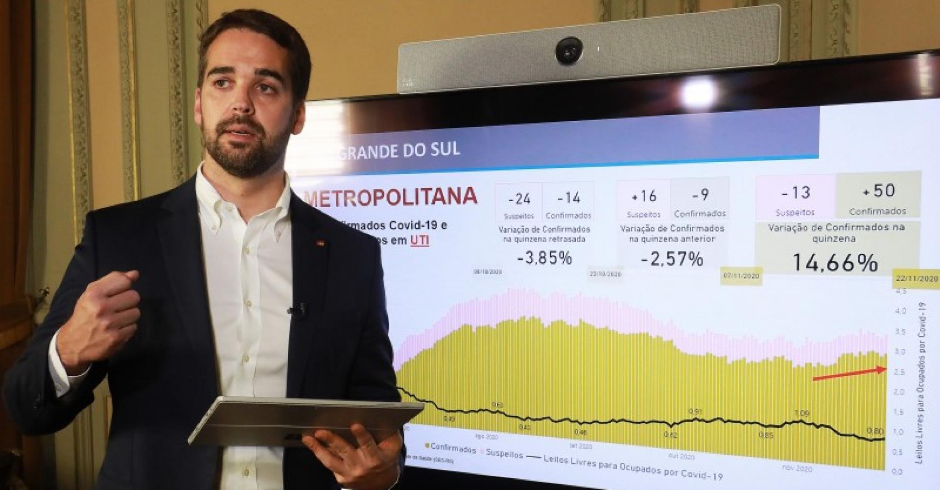Como forma de manter a população gaúcha atualizada a respeito da evolução do coronavírus no Rio Grande do Sul, o governador Eduardo Leite realizou, na tarde desta segunda-feira (23/11), uma transmissão ao vivo (live) pelas redes sociais. Além de esclarecer dúvidas de jornalistas e de trazer dados referentes a cada uma das macrorregiões do Estado, Leite também apresentou o mapa definitivo da 29ª rodada do modelo de Distanciamento Controlado.
