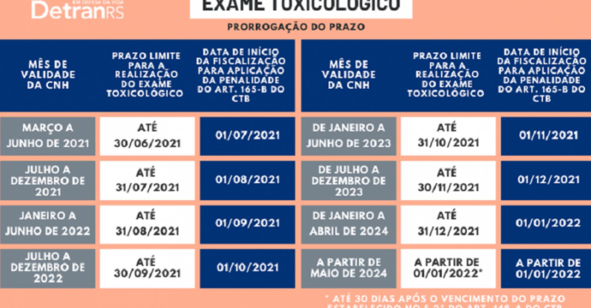 Os laboratórios credenciados têm até 24 horas para informar a data e hora da coleta e, até o final de 2021, os resultados deverão ser registrados em até 25 dias. A partir de 2022, essa informação volta a ser cadastrada em até no máximo 15 dias. Resultado positivo no exame toxicológico acarretará a suspensão do direito de dirigir por três meses.