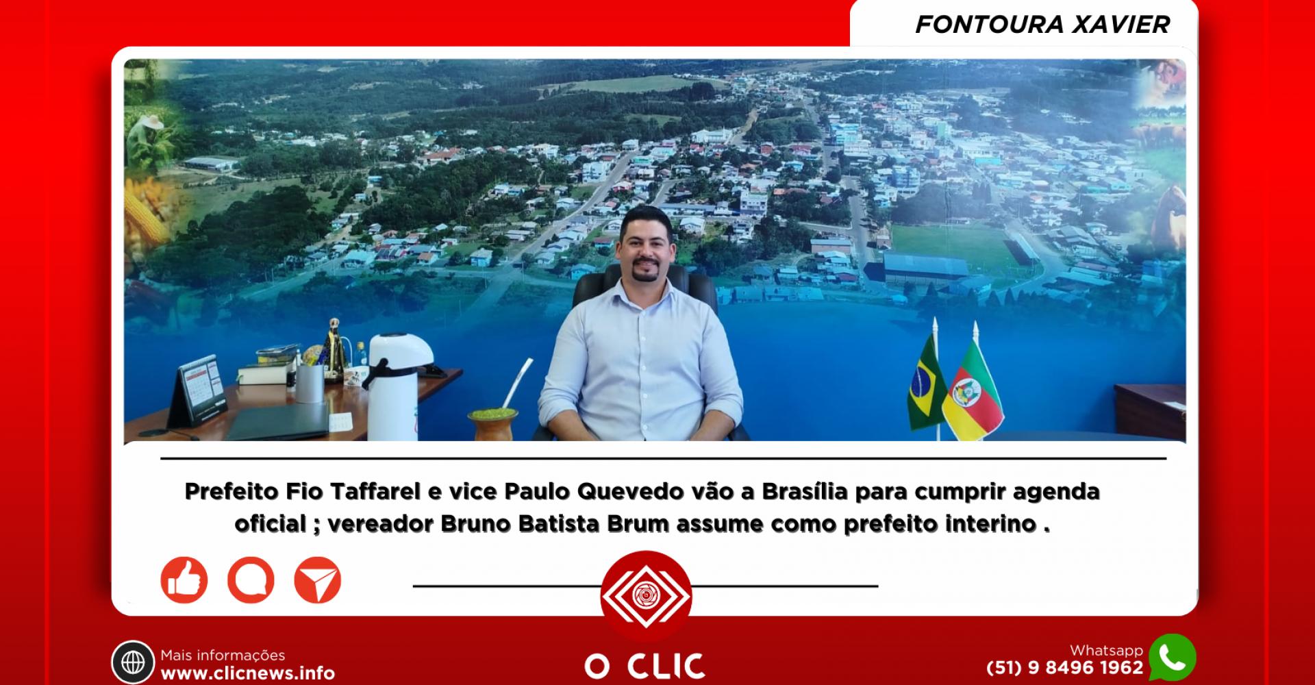Prefeito Fio Taffarel e vice Paulo Quevedo vão a Brasília para cumprir agenda oficial ; vereador Bruno Batista Brum assume como prefeito interino .