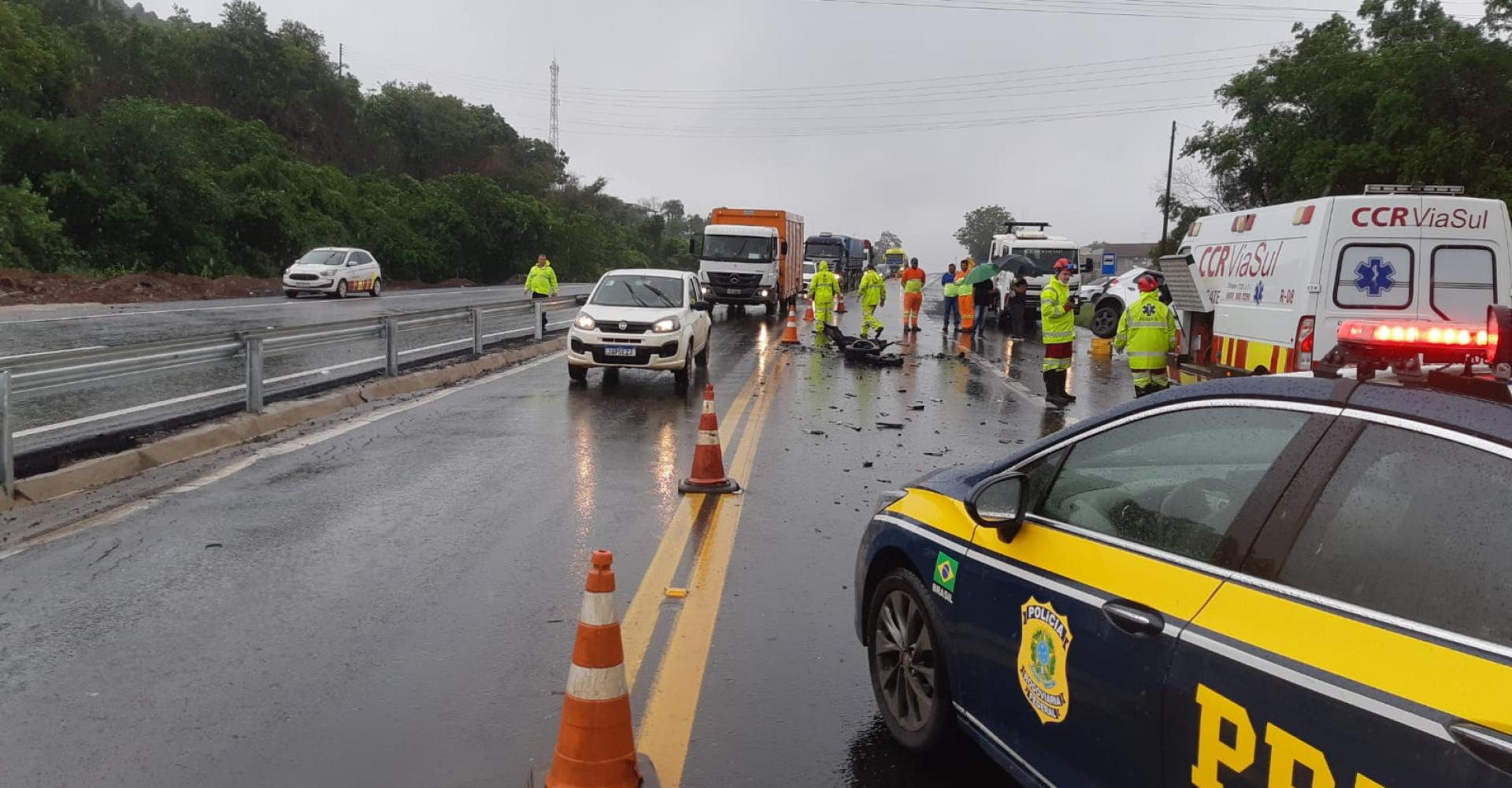 Os veículos envolvidos foram um automóvel VW Crossfox com placa de Sapiranga e um cavalo-trator Scania R 420 com placa de Nicolau Vergueiro, tracionando dois semi-reboques da mesma cidade.