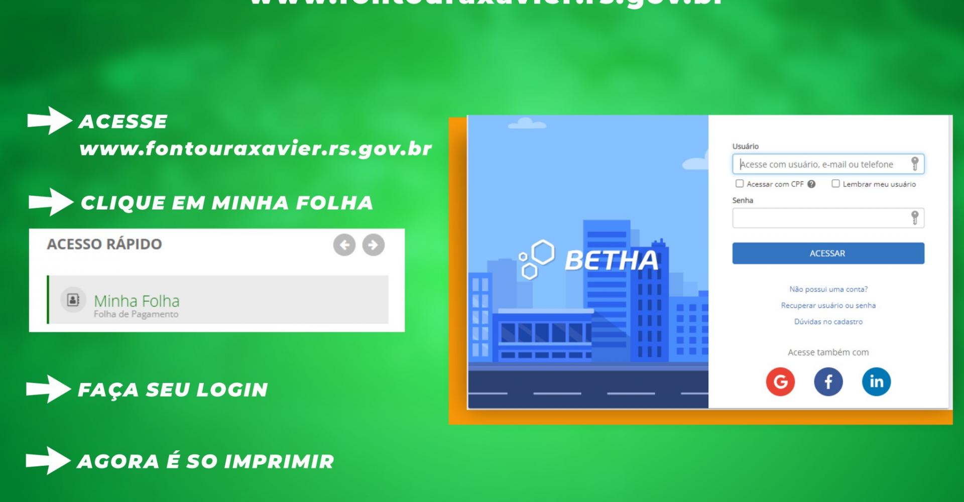 O Prefeito Municipal, Luiz Armando Taffarel e o Secretário da Administração, Rudinei de Farias, pensando na agilidade dos serviços para o Servidor Público Municipal, a partir desta terça-feira, 21/12/2021, estão disponibilizando no site oficial do Município de Fontoura Xavier o “Minha Folha” que é um serviço online para que o próprio servidor tenha acesso aos seguintes serviços: