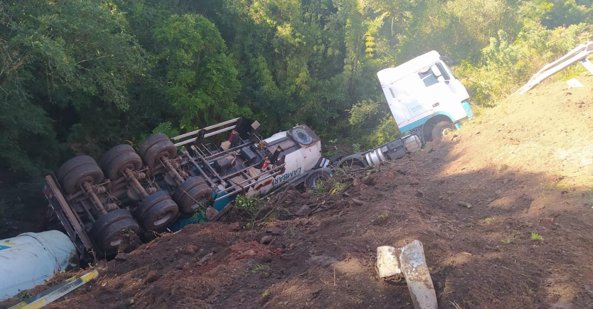 Em Soledade/RS,entre os kms kms 227 e 220 da BR386, trânsito totalmente interrompido, devido ao tombamento de um caminhão de combustível, com vazamento do produto. FEPAM e Bombeiros acionados. Desvio: Sentido interior no km 249 e sentido capital, no km 214.