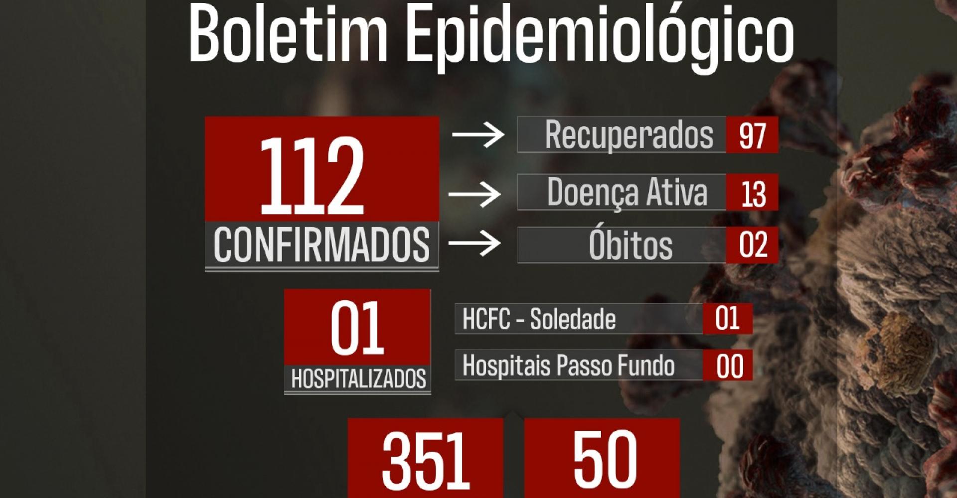 O município soma no total 112 casos da doença, dos quais 13 estão ativos no momento e um encontra-se hospitalizado no HCFC de Soledade.