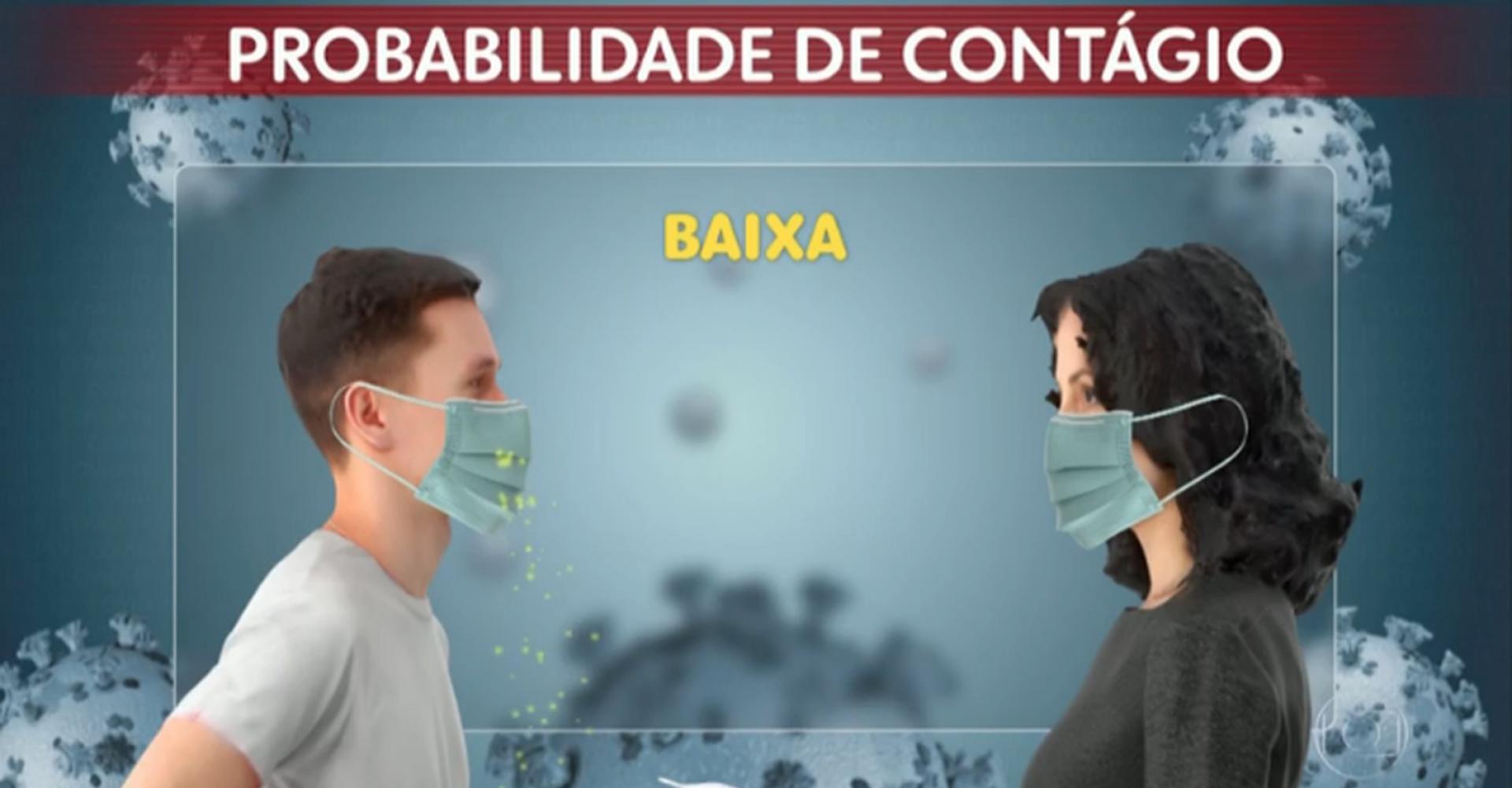Veja, mais abaixo, ilustrações que mostram as chances de contágio entre duas pessoas que conversam. Uma delas está doente (a da esquerda); a outra, não. As situações mostram a probabilidade de se contaminar se apenas uma delas está usando máscara, se nenhuma delas está usando o acessório e se as duas estão usando.