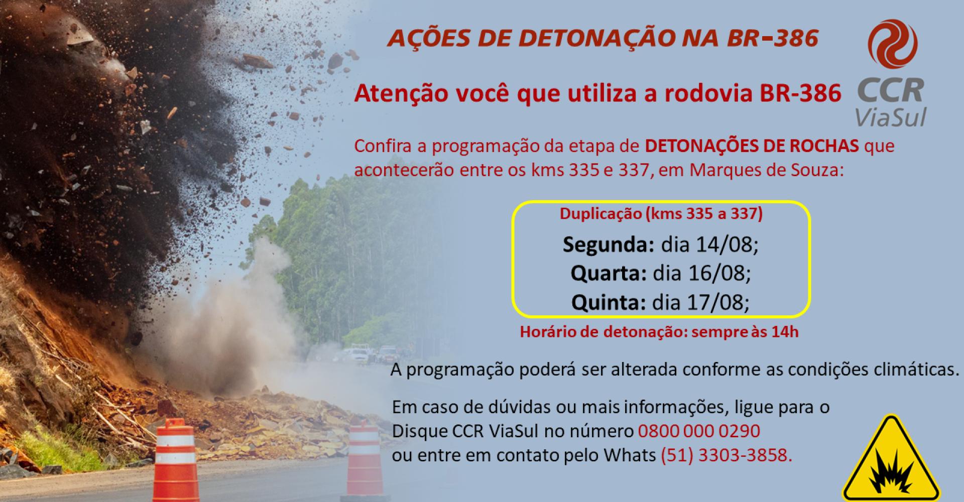 Motoristas que pretendem seguir viagem pela BR-386 devem ficar atentos à programação de detonação de rochas prevista para a próxima semana. Conforme a CCR ViaSul, as intervenções devem acontecer de segunda, quarta e quinta (14, 16 e 17), sempre às 14h, entre os kms 335 e 337, em Marques de Souza.